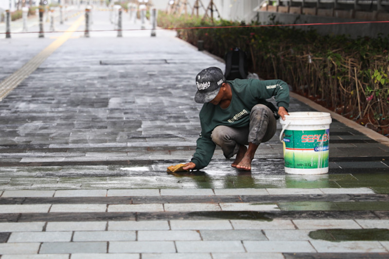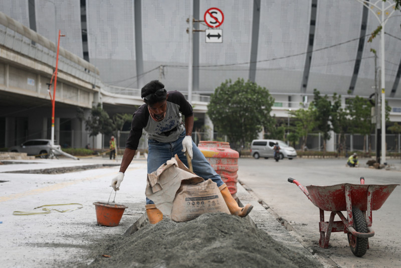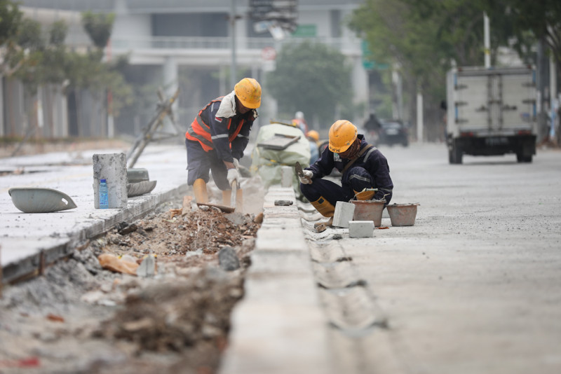 Sejumlah pekerja mengerjakan proyek pembangunan trotoar di sekitar Jakarta International Stadium (JIS), Jalan Danau Sunter Barat, Tanjung Priok, Jakarta Utara, Selasa (24/10). Dinas Bina Marga DKI Jakarta bertanggung jawab terhadap penyempurnaan fasilitas penunjang di sekitar JIS seperti trotoar, akses jalan, hingga lampu penerangan jelang penyelenggaraan Piala Dunia FIFA U-17 pada bulan November 2023.