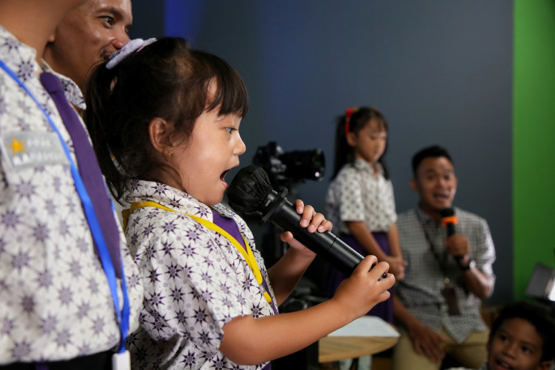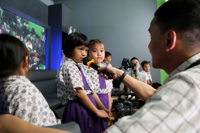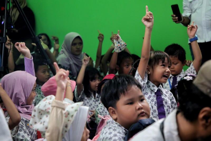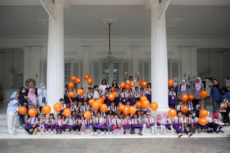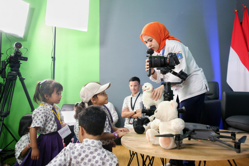 Sebanyak 52 murid Taman Kanak-kanak Putra Setia dari Yayasan Rukun Istri Sejahtera menyambangi kantor Dinas Komunikasi, Informatika, dan Statistika (Kominfotik) Provinsi DKI Jakarta di Blok F Gedung Balai Kota DKI Jakarta, Jalan Medan Merdeka Selatan, Gambir, Jakarta Pusat, Rabu (25/10). Para anak-anak antusias saat disuguhkan berbagai macam kegiatan seperti pembacaan dongeng, video edukasi, hingga memperkenalkan alat kamera hingga drone.
