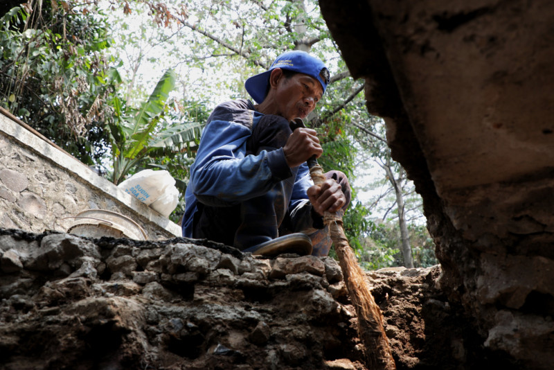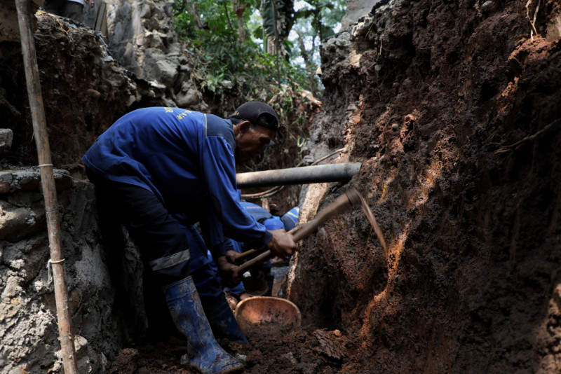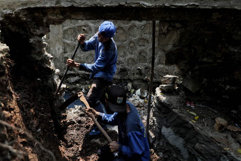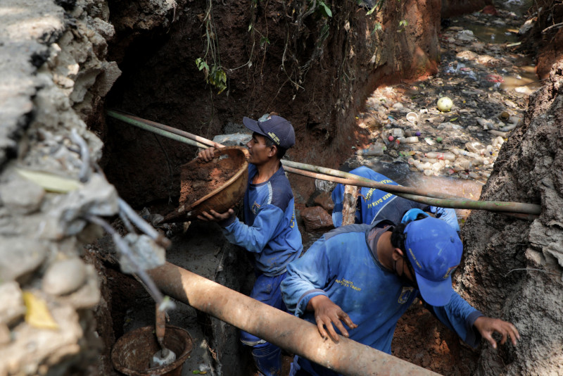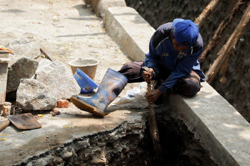 Satuan Pelaksana Sumber Daya Air (Satpel SDA) Kecamatan Kramat Jati, Jakarta Timur perbaiki turap crosing yang longsor di saluran penghubung (Phb) Jalan Al Hidayah RT 01/03 Kelurahan Cililitan, Kramat Jati, Jakarta Timur. Crosing yang membentang di Jalan Al Hidayah ini merupakan akses penghubung pemukiman warga RT 01/03 Cililitan menuju ke Jalan Raya Cililitan Besar atau ke PGC.