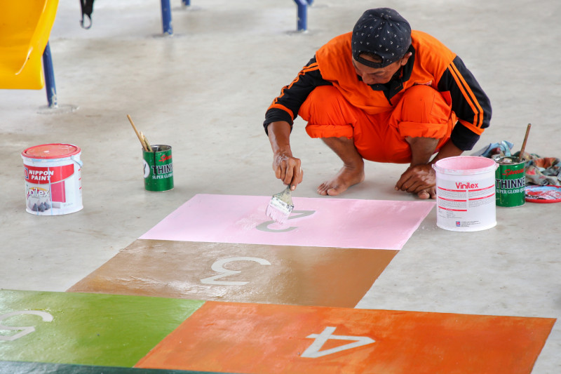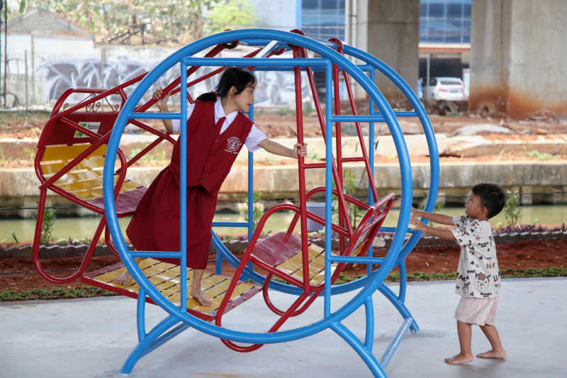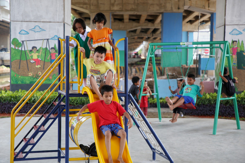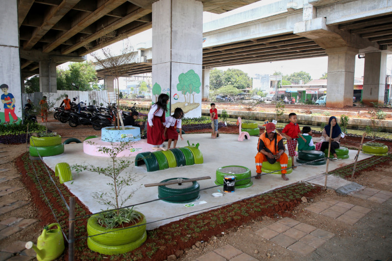 Melihat Taman Interaksi Warga di Kolong Tol Becakayu RW 10 Jalan Inspeksi Tarum Barat, Kelurahan Cipinang Melayu, Makasar, Jakarta Timur. Taman ini dibangun atas hasil sinergi pihak Kelurahan Cipinang Melayu dengan PT Pegadaian.