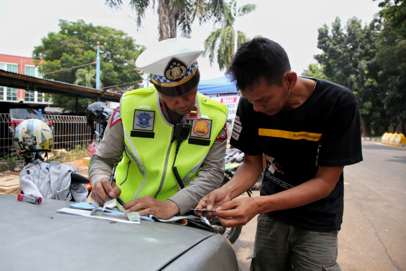 Suku Dinas LH Jakarta Selatan bersama Sudinhub Jakarta Selatan dan Satlantas Polres Jakarta Selatan menggelar razia Uji Emisi di Jalan R.A. Kartini, Pondok Pinang, Kebayoran Lama, Jakarta Selatan, Rabu (1/11). Dari total 32 kendaraan yang terjaring razia, ada 2 kendaraan yang tidak lulus uji emisi sehingga dikenakan tilang ditempat.