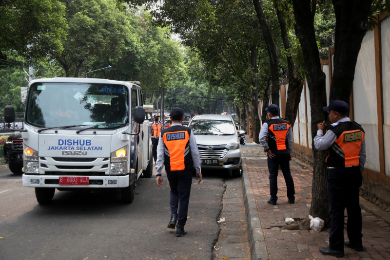 Petugas Suku Dinas Perhubungan (Sudinhub) Jakarta Selatan melakukan penertiban pada kendaraan yang parkir sembarangan di Jalan DPR Raya, Rawajati, Pancoran, Jakarta Selatan. Selama bulan Oktober 2023 sebanyak 1.164 kendaraan ditindak Sudinhub Jakarta Selatan lantaran parkir sembarangan dilokasi yang tidak semestinya.