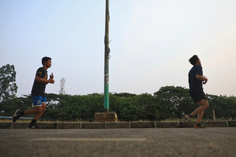 Melihat aktivitas warga menghabiskan waktu sore dengan berolahraga di kawasan Kanal Banjir Timur (KBT), Jalan Kolonel Sugiono, Duren Sawit, Jakarta Timur, Selasa (7/11). Sejumlah olahraga seperti jogging, bermain sepak bola, buku tangkis dan menikmati fitnes outdoor.