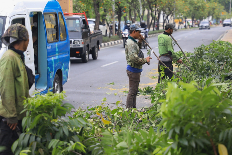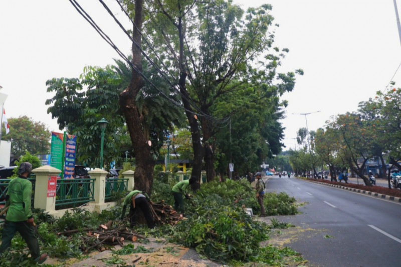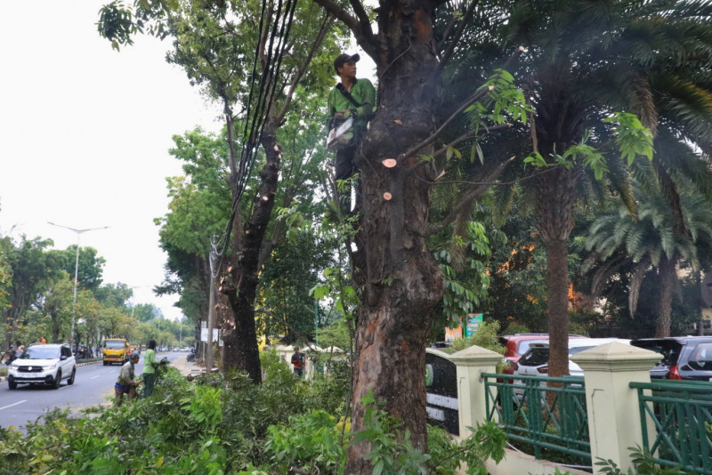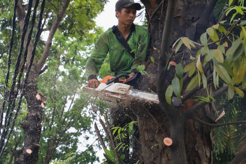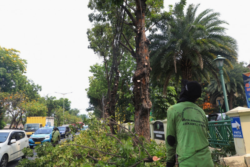 Petugas Suku Dinas Pertamanan dan Hutan Kota (Sudin Tamhut) Jakarta Timur melakukan penopingan pohon di Jalan Radin Inten Raya, Duren Sawit, Jakarta Timur, Rabu (8/11). Sebanyak enam pohon ditoping petugas terdiri dari 5 pohon mahoni dan satu pohon beringin.