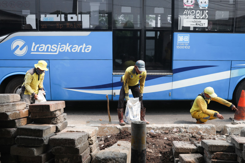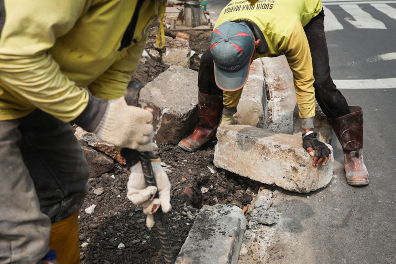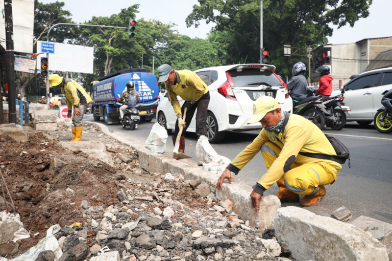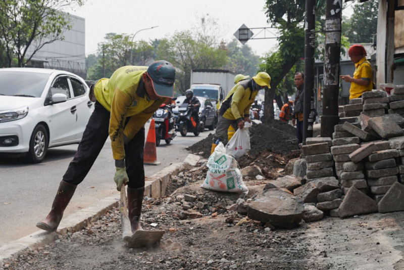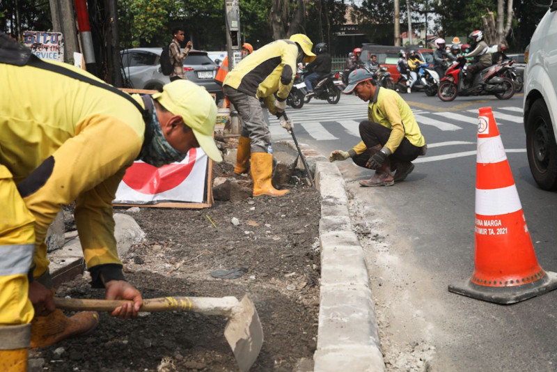 Satuan Petugas (Satgas) Bina Marga Kecamatan Kramat Jati melakukan pembangunan trotoar di sisi Jalan H. Bokir Bin Dji\'un, Kramat Jati, Jakarta Timur, Jumat (10/11). Pembangunan trotoar di simpang Hek tersebut dilakukan untuk memberikan keamanan dan kenyamanan pejalan kaki yang melintas.
