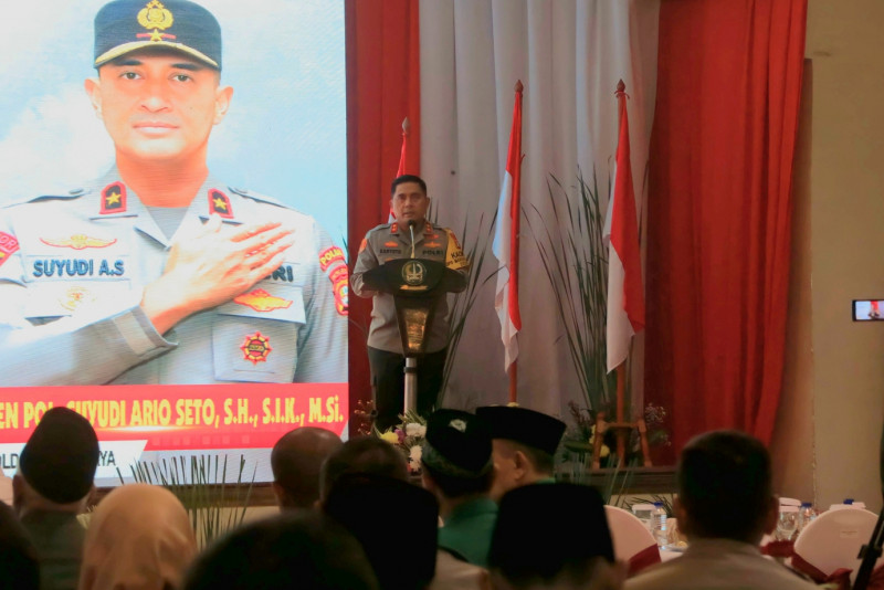 Penjabat (Pj) Gubernur DKI Jakarta, Heru Budi Hartono menghadiri Kegiatan Silaturahmi Kapolda Metro Jaya bersama Forum Koordinasi Pimpinan Daerah (Forkopimda) dan Tokoh Masyarakat di Gedung Balai Pertemuan Metro Jaya, Jalan Jenderal Sudirman, Jakarta Selatan, Senin (13/11). Acara ini dalam rangka sosialisasi untuk mensukseskan Pemilihan Umum (Pemilu) damai dan aman.