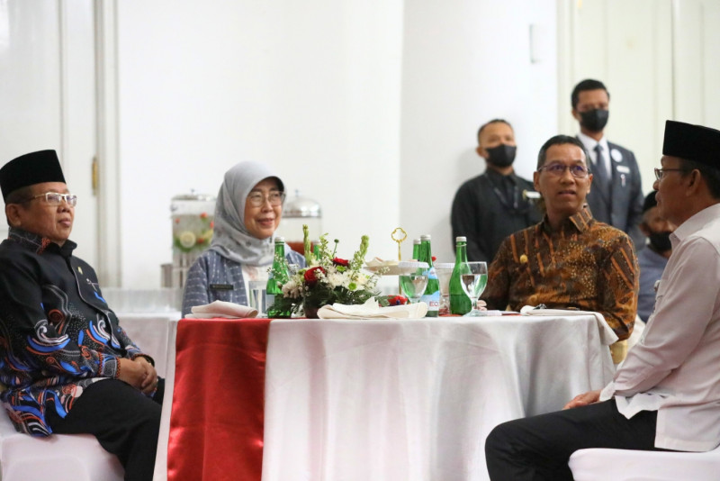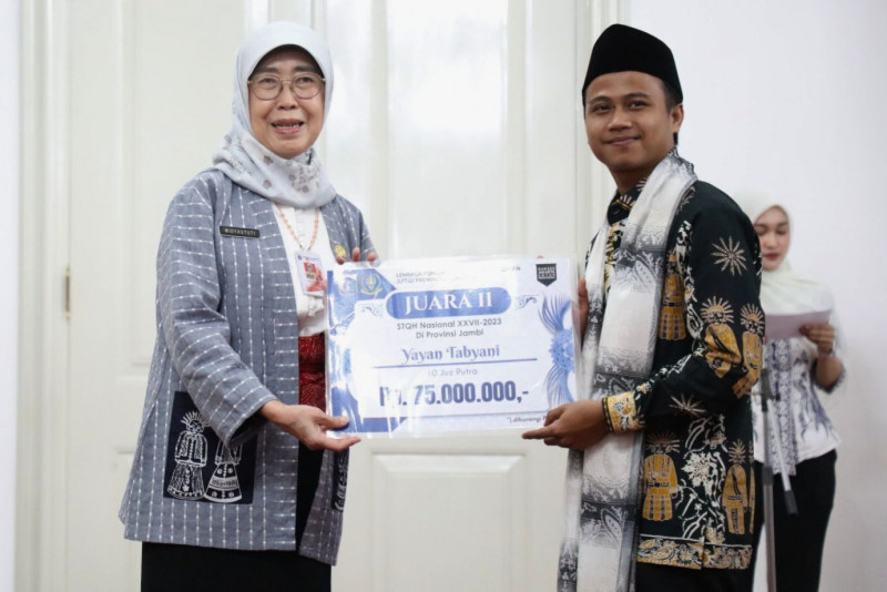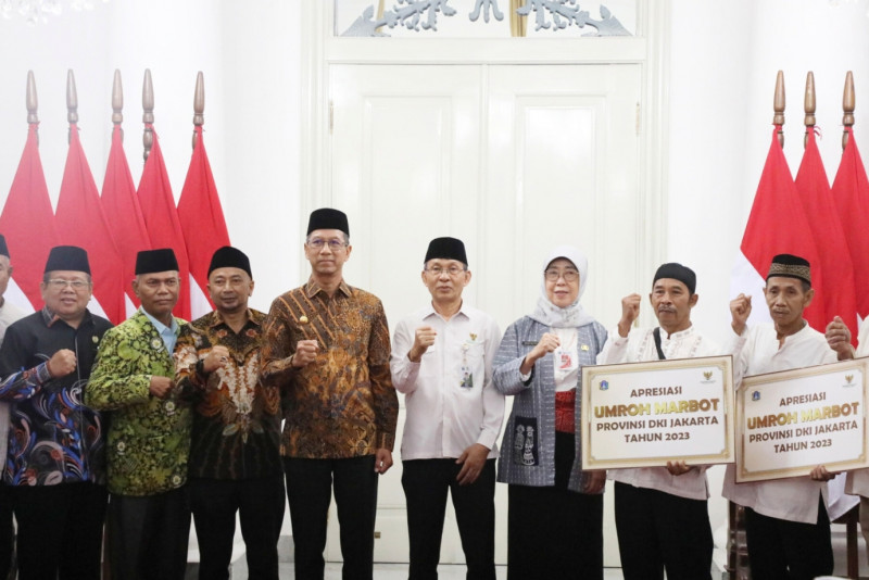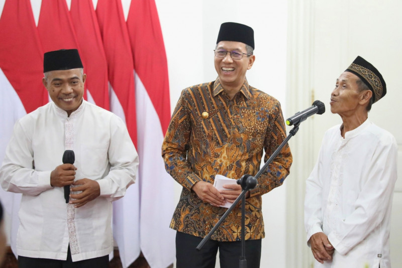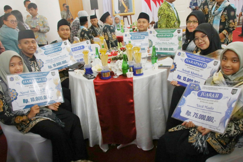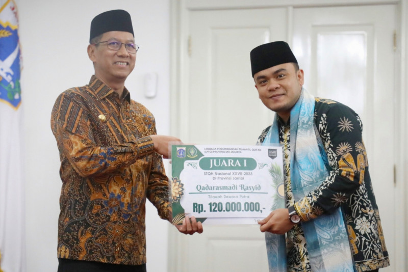 Penjabat (Pj) Gubernur DKI Jakarta, Heru Budi Hartono memberikan apresiasi kepada Kafilah Provinsi DKI Jakarta yang berhasil meraih juara di Seleksi Tilawatil Qur’an dan Hadits (STQH) Nasional ke-27 tahun 2023 di Jambi beberapa waktu lalu, pemberian dilakukan di Balairung, Balai Kota DKI Jakarta, Kamis (23/11). Dalam kesempatan ini, Pj Gubernur juga memberikan apresiasi kepada 12 marbot untuk beribadah umroh melalui program yang dilakukan oleh Pemprov DKI bersama Dewan Masjid Indonesia (DMI). (Foto:Mochnad Tresna Suheryanto/beritajakarta.id)