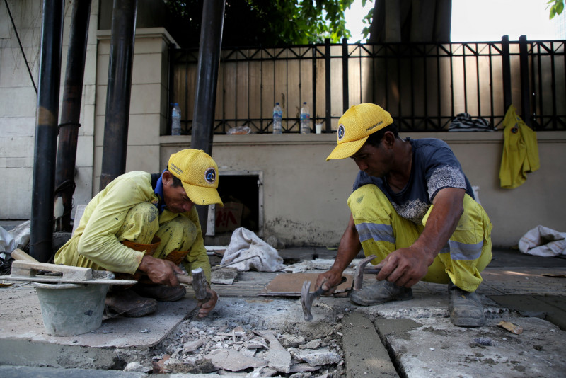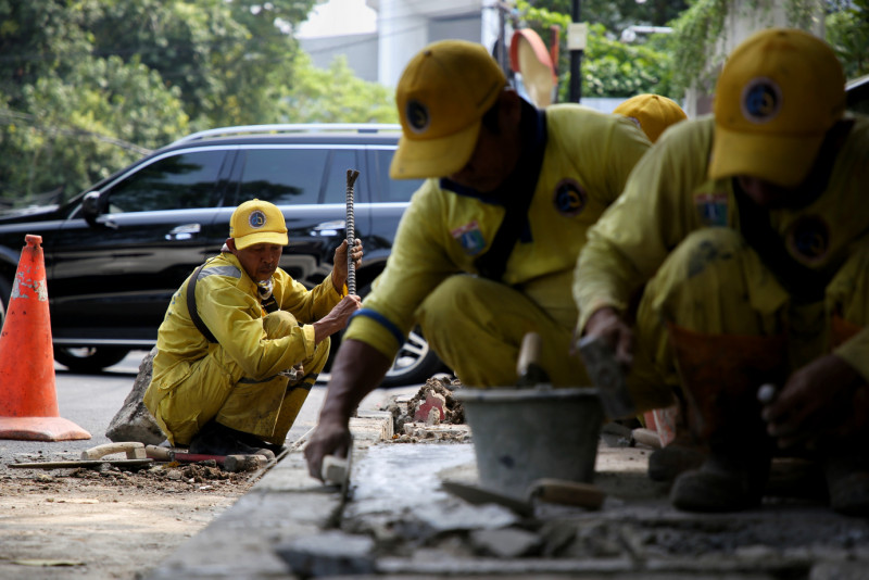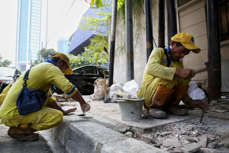 Delapan Petugas Suku Dinas Bina Marga Jakarta Pusat, melakukan perbaikan trotoar yang rusak di Jalan Haji Agus Salim, Menteng, Jakarta Pusat, Jumat (24/11). Perbaikan yang dilakukan sepanjang tujuh meter tersebut meliputi pemasangan ulang kanstin dan keramik trotoar. (Foto: Andri Widiyanto/beritajakarta.id)