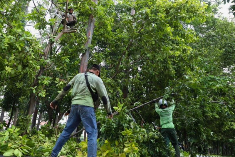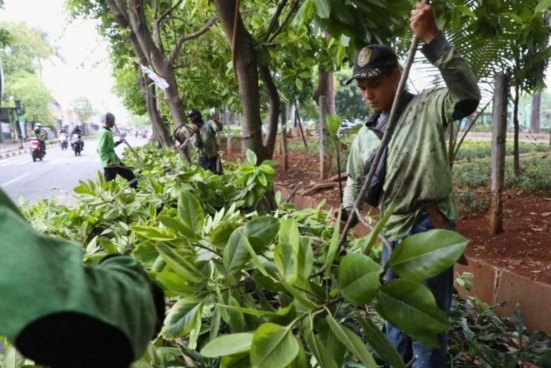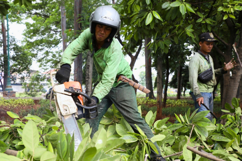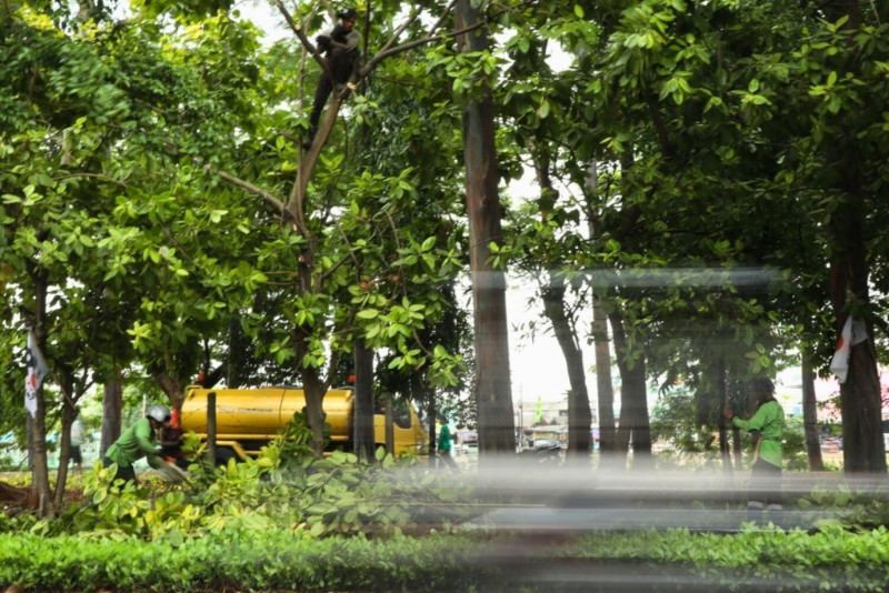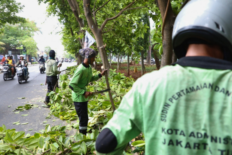 Lima pohon di Jalan Kolonel Sugiono, Duren Sawit, Jakarta Timur ditoping oleh tujuh Petugas Suku Dinas Pertamanan dan Hutan Kota (Distamhut) Jakarta Timur, Senin (27/11). Penopingan dilakukan karena kondisi daunnya yang sudah lebat sehingga membahayakan pengendara yang melintasi kawasan itu. (Foto: Mochamad Tresna Suheryanto/beritajakarta.id)