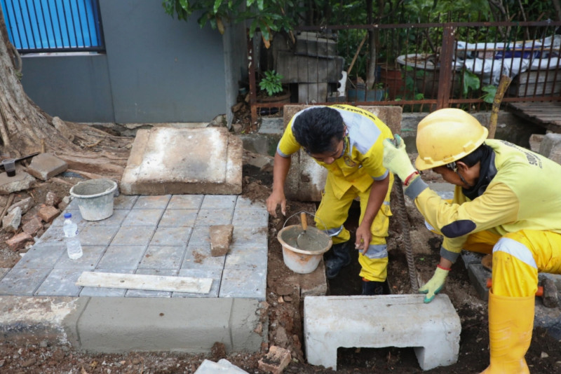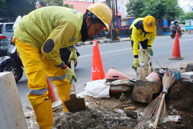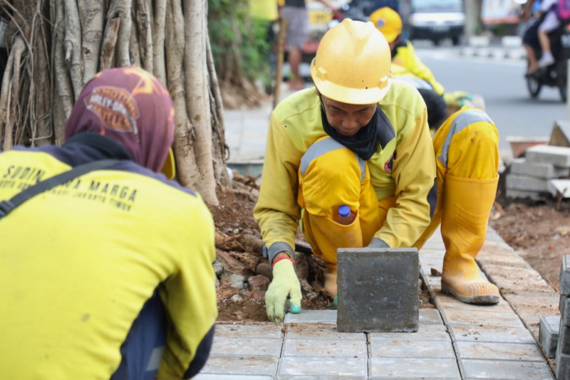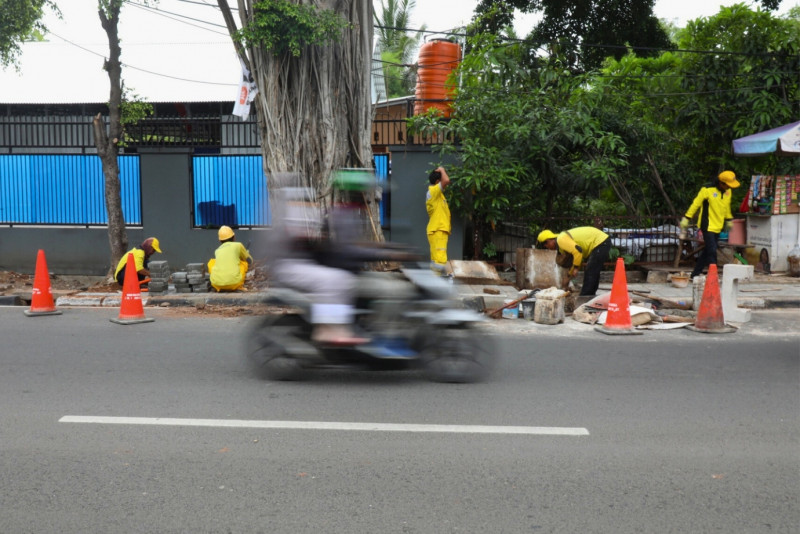 Enam Petugas Suku Dinas Bina Marga Kecamatan Duren Sawit melakukan perbaikan trotoar di Jalan Pondok Kelapa Raya, Pondok Kelapa, Duren Sawit, Jakarta Timur, Senin (27/11). Perbaikan sepanjang 50 meter dengan lebar 1,3 meter tersebut ditargetkan rampung pada pekan depan. (Foto: Mochamad Tresna Suheryanto/beritajakarta.id)