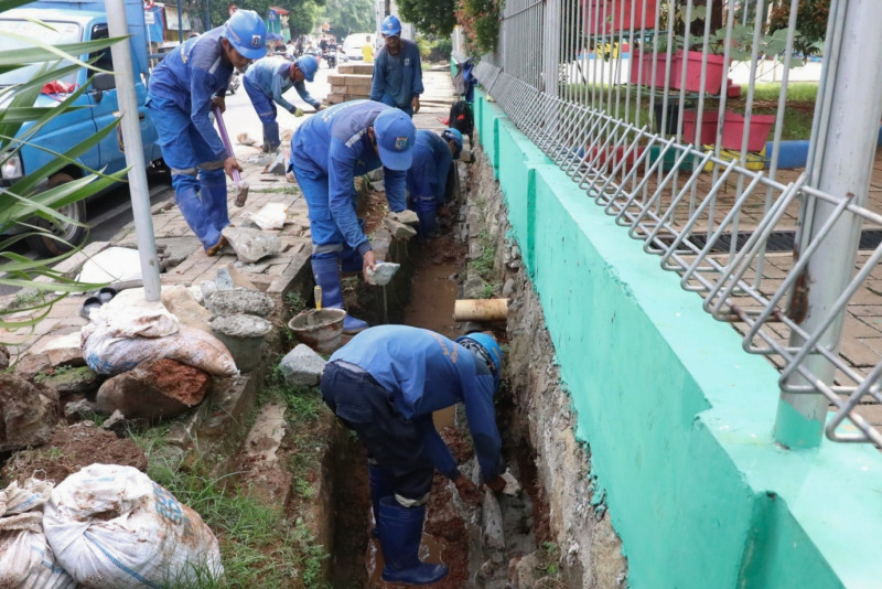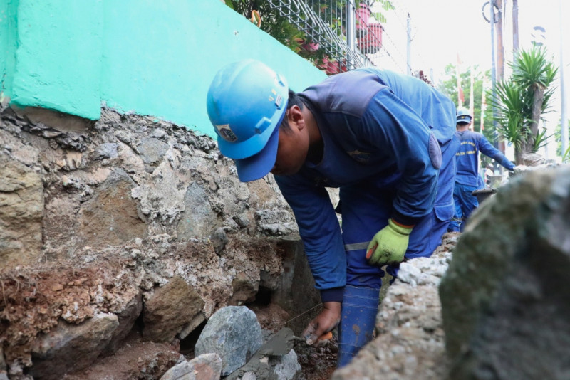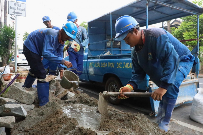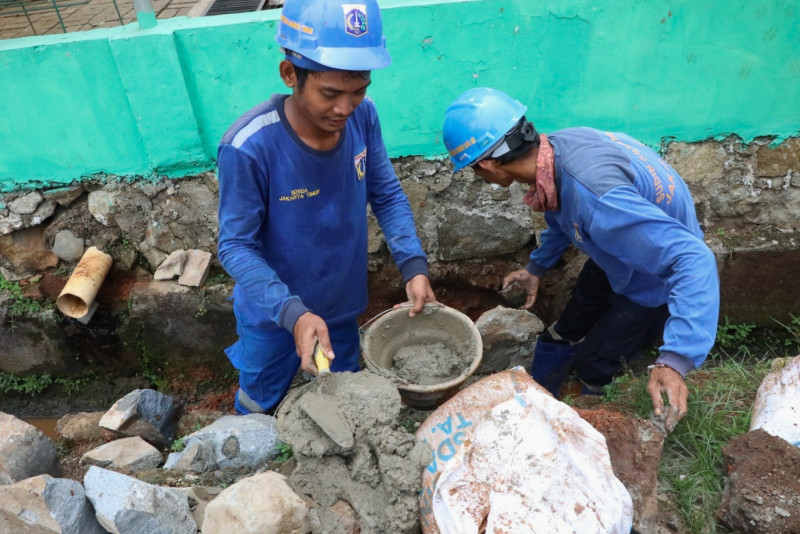 Enam Petugas Satuan Pelaksana Sumber Daya Air (Satpel SDA) Kecamatan Duren Sawit memperbaiki dinding saluran yang longsor di Jalan Bunga Rampai Raya, Kelurahan Malaka Jaya, Jakarta Timur, Rabu (29/11). Turap yang diperbaiki sepanjang 50 meter dan lebar 60 sentimeter ini dilakukan karena dinding turap sudah rusak termakan usia. Perbaikan dimulai dari 22 November 2023 ditargetkan rampung pada tanggal 6 Desember mendatang. (Foto: Mochamad Tresna Suheryanto/beritajakarta.id)