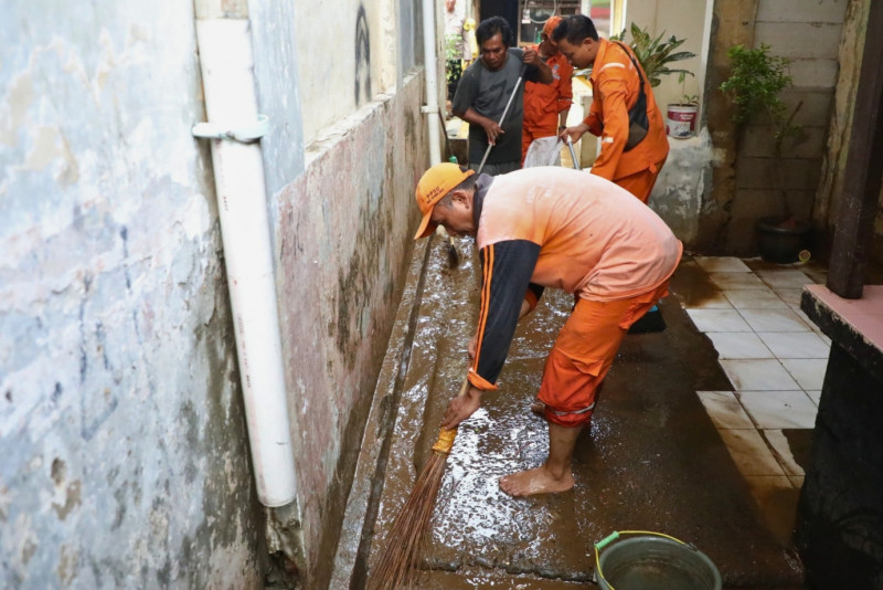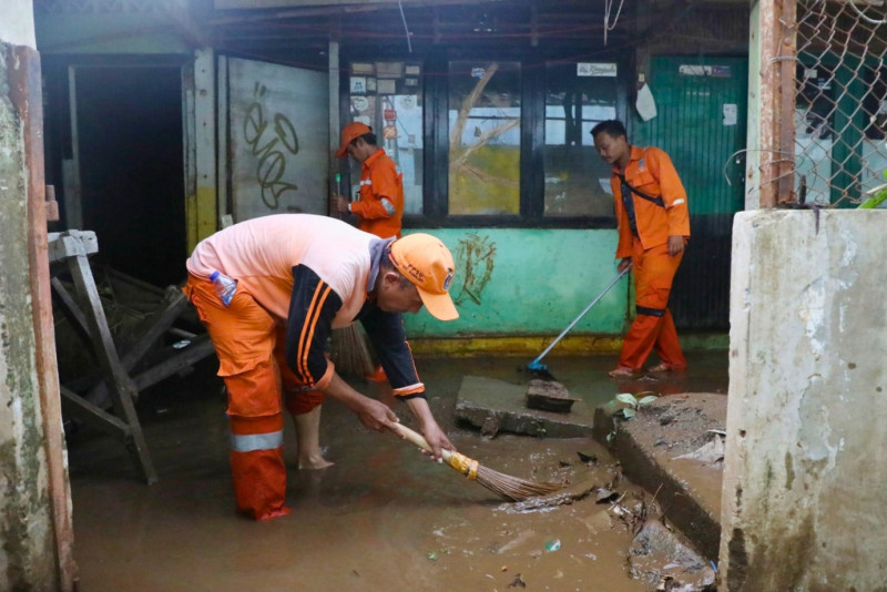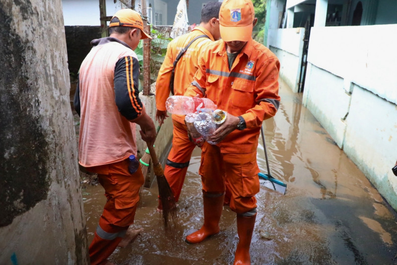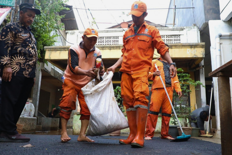 Petugas PPSU Rawajati Bersihkan Lumpur di Pemukiman Warga