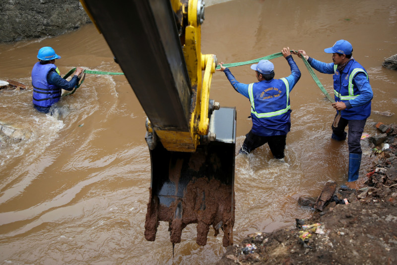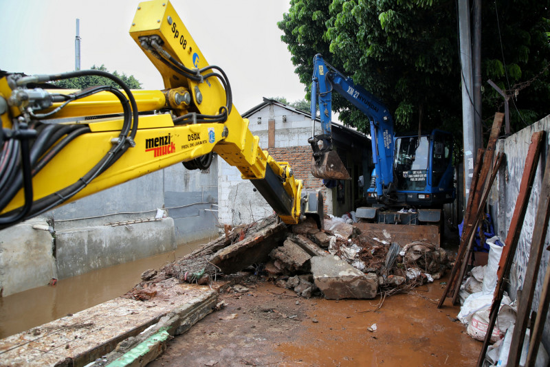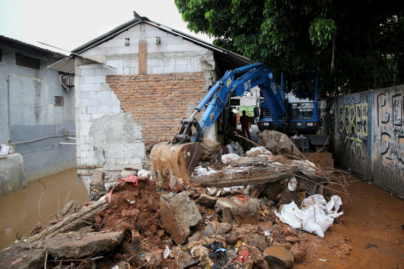 Sebanyak 100 petugas gabungan melakukan penanganan bangunan longsor di Jalan Kali Baru RT 02/02, Kelurahan Batu Ampar, Kramat Jati, Jakarta Timur, Jumat (1/12). Bangunan yang berdiri di atas Kali Baru ini longsor sepanjang 40 meter dengan lebar 30 sentimeter dan tinggi dua meter pada Kamis (30/11) kemarin. (Foto: Andri Widiyanto/beritajakarta.id)