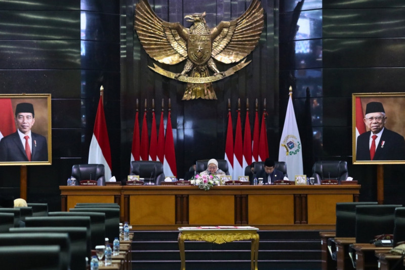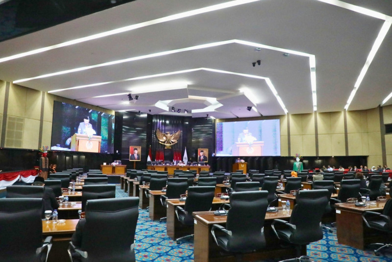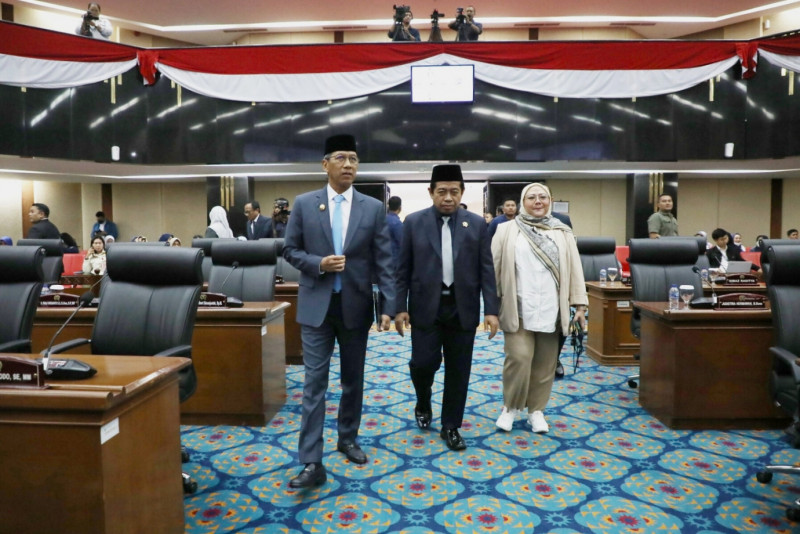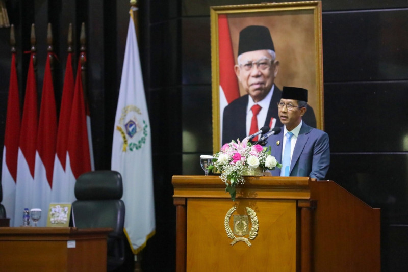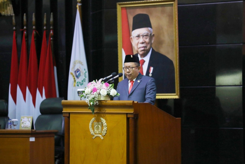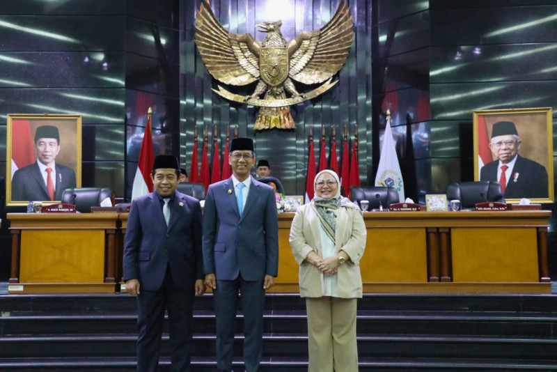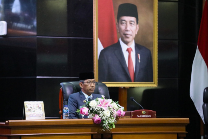 Penjabat (Pj) Gubernur DKI Jakarta, Heru Budi Hartono menghadiri rapat paripurna DPRD Provinsi DKI Jakarta, di ruang rapat paripurna DPRD Provinsi DKI Jakarta, Rabu (6/12). Rapat ini beragendakan penyampaian laporan hasil pembahasan Bapemperda terhadap Raperda tentang Perubahan Bentuk Hukum Perseroan Terbatas Food Station Tjipinang Jaya menjadi Perseroan Terbatas Food Station Tjipinang Jaya (Perseroan Daerah), Raperda tentang Rencana Umum Energi Daerah Provinsi DKI Jakarta, dan Raperda tentang Pajak Daerah dan Retribusi Daerah. (Foto: Mochamad Tresna Suheryanto/berita jakarta.id)