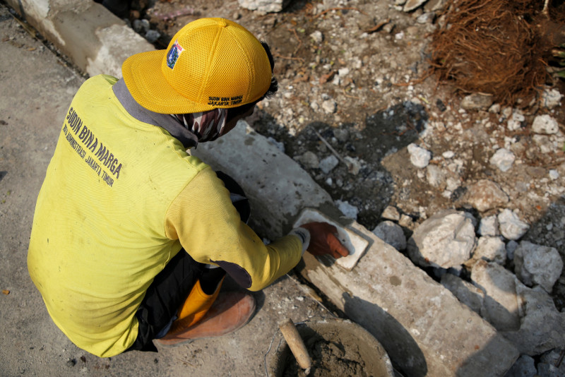 Petugas Satuan Bina Marga Kecamatan Ciracas membangun trotoar baru di Jalan Raya Bogor, Pekayon, Pasar Rebo, Jakarta Timur, Kamis (7/12). Pembangunan trotoar sepanjang 80 meter dan lebar 120 sentimeter sudah mencapai 80 persen ini dilakukan untuk memberikan kenyamanan kepada para pejalan kaki. (Foto: Andri Widiyanto/beritajakarta.id)