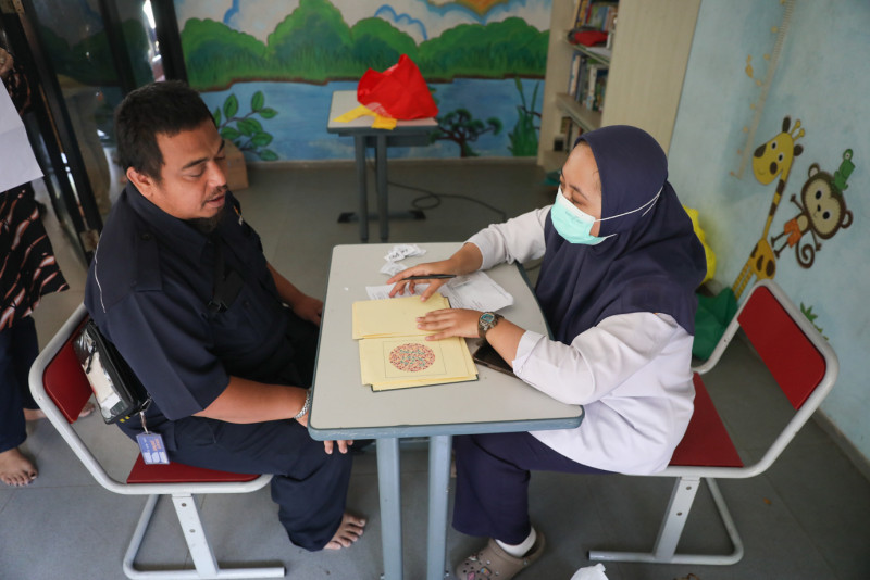 Puskesmas Kecamatan Kramat Jati menggelar pemeriksaan kesehatan untuk calon petugas Kelompok Penyelenggara Pemungutan Suara (KPPS) di RPTRA Udara Segar, Kelurahan Batu Ampar, Kramat Jati, Jakarta Timur, Rabu (20/12). Sebanyak 200 calon petugas KPPS menjalani pemeriksaan kesehatan yang meliputi cek tensi dan tekanan darah, gula darah, pengukuran lingkar perut dan tinggi badan, serta tes buta warna. (Foto: Nugroho Sejati/beritajakarta.id)