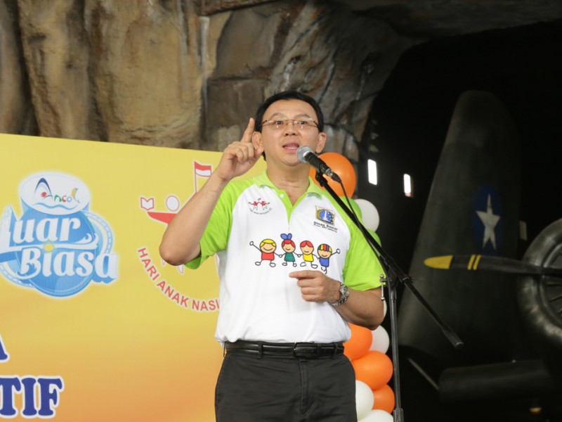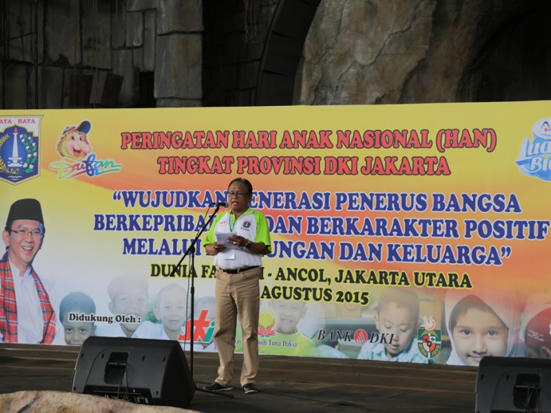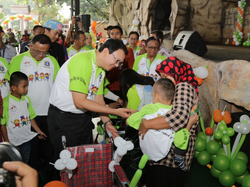 Gubernur DKI Jakarta, Basuki Tjahaja Purnama menghadiri peringatan Hari Anak Nasional Tahun 2015 di Wahana Dunia Fantasi, Ancol Taman Impian, Jakarta Utara, Rabu (26/8/2015). Dalam kesempatan tersebut, Basuki menyerahkan santuan dan bantuan berupa kursi roda, kaki palsu dan perlengkapan sekolah. (Foto: Yopie/beritajakarta.com)
