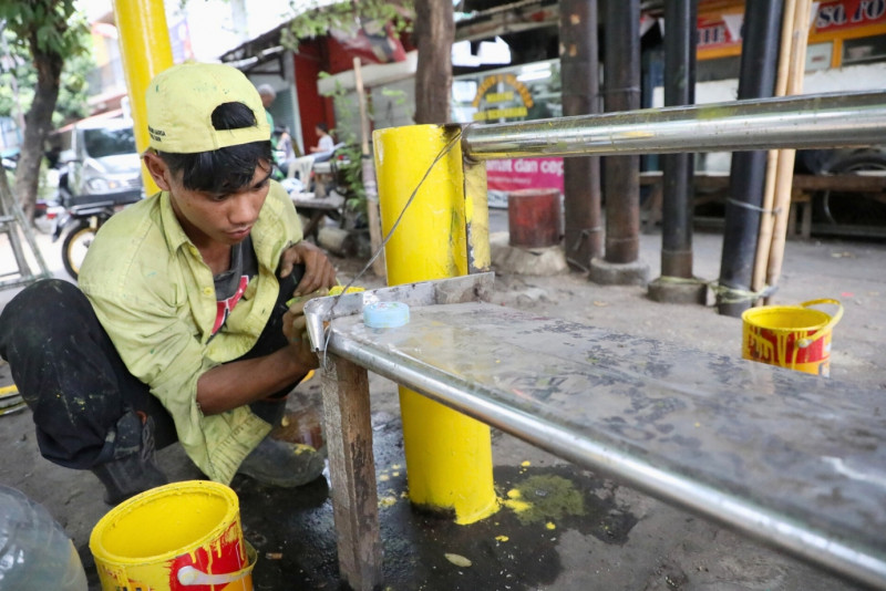 Enam petugas Suku Dinas (Sudin) Bina Marga Jakarta Timur melakukan perawatan Halte Bus Radjiman di Jalan Dr KRT Radjiman Widyodiningrat, Rawa Terate, Cakung, Jakarta Timur, Rabu (20/12). Perawatan halte ini berupa pengecatan ulang sebab kondisi cat pada halte telah banyak yang memudar dan terkelupas. Dengan adanya pengecatan ini diharapkan dapat memberikan kenyamanan bagi masyarakat pengguna transportasi umum. (Foto: Mochamad Tresna Suheryanto/beritajakarta.id)