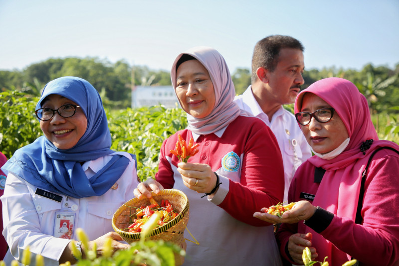 Penjabat (Pj) Gubernur DKI Jakarta, Heru Budi Hartono melakukan panen cabai bersama secara serentak dengan Kelompok Tani Pinggir Bumi (KTPB) di Buperta Cibubur, Cipayung, Jakarta Timur, Rabu (20/12). Panen cabai juga dilakukan secara hybrid bersama Provinsi Jawa Barat, Banten, Jawa Tengah, Daerah Istimewa Yogyakarta, dan Sulawesi Selatan yang merupakan mitra kerja sama Pemprov DKI dalam pengembangan potensi daerah. (Foto: Andri Widiyanto/beritajakarta.id)