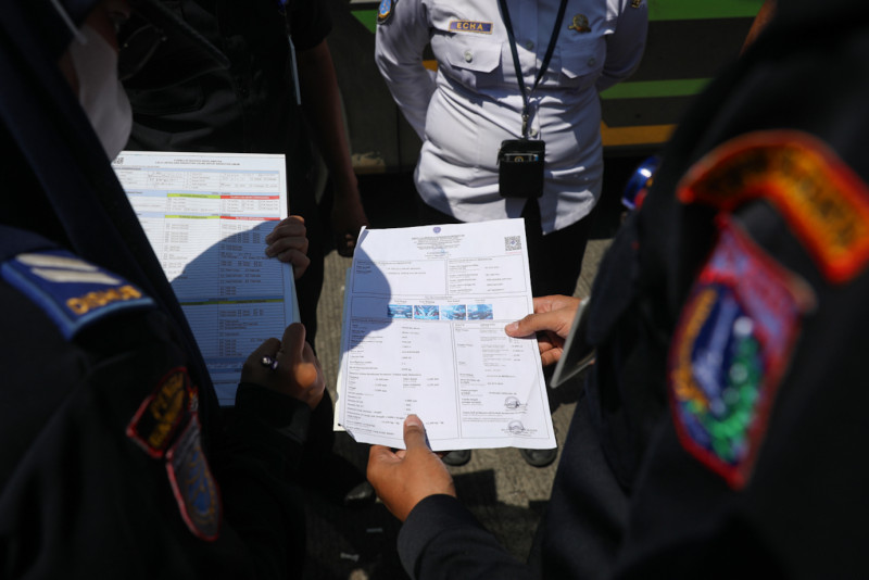 Petugas Dinas Perhubungan (Dishub) DKI Jakarta melakukan ramp check bus antarkota antarprovinsi (AKAP) di Terminal Kampung Rambutan, Ciracas, Jakarta Timur, Rabu (20/12). Ramp check dilakukan untuk memastikan kondisi bus laik jalan menjelang arus mudik pada libur Natal dan Tahun Baru (Nataru) 2024 yang diprediksi akan terjadi pada, Sabtu (23/12) mendatang. (Foto: Nugroho Sejati/beritajakarta.id)