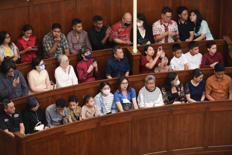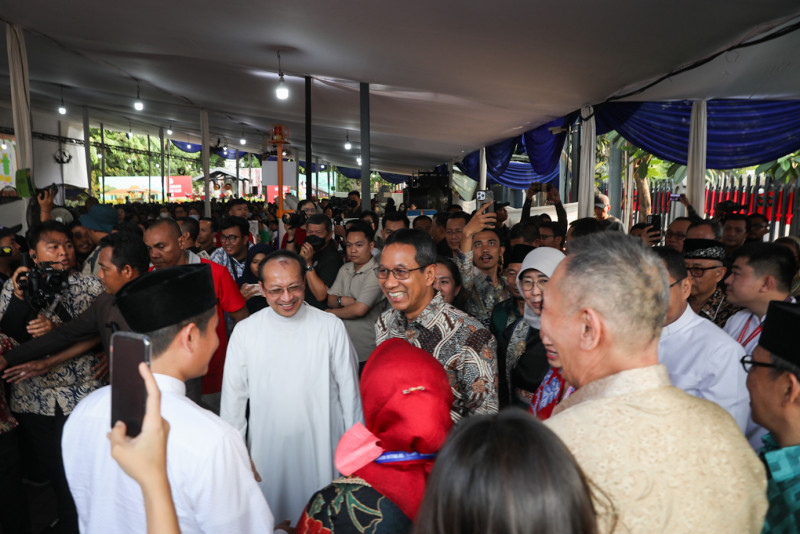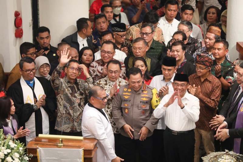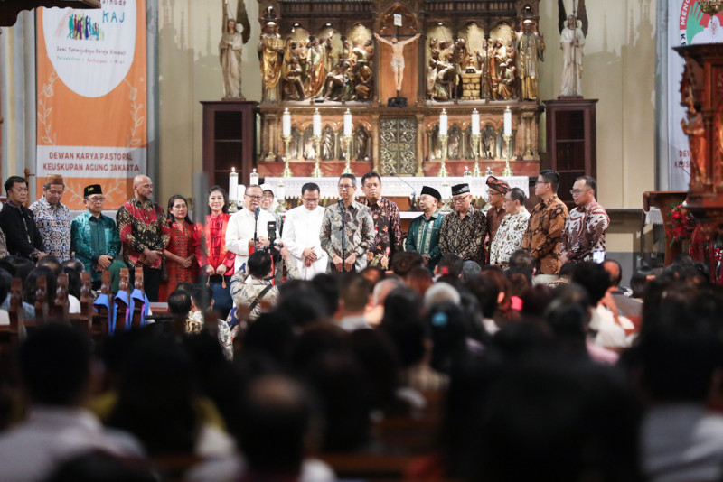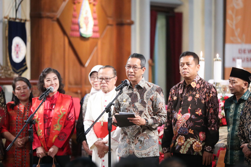 Penjabat (Pj) Gubernur Heru Budi Hartono bersama jajaran Forkopimda DKI Jakarta mengunjungi sejumlah gereja di Jakarta Pusat pada malam Misa Natal 2023, Minggu (24/12). Adapun sejumlah gereja yang dikunjungi adalah Gereja Katedral Jakarta, Gereja Kristen Indonesia (GKI) Gunung Sahari, dan GPIB Immanuel Jakarta. (Foto: Nugroho Sejati/beritajakarta.id)