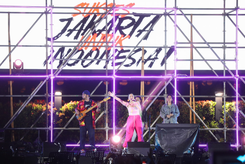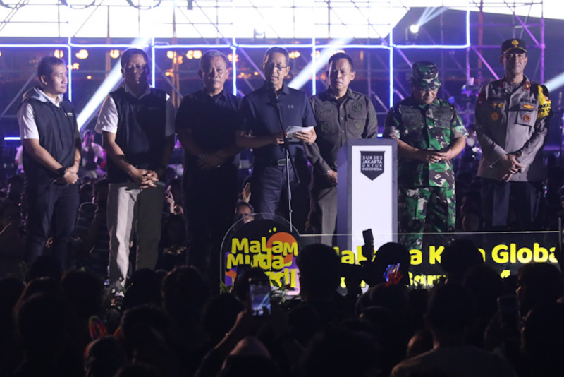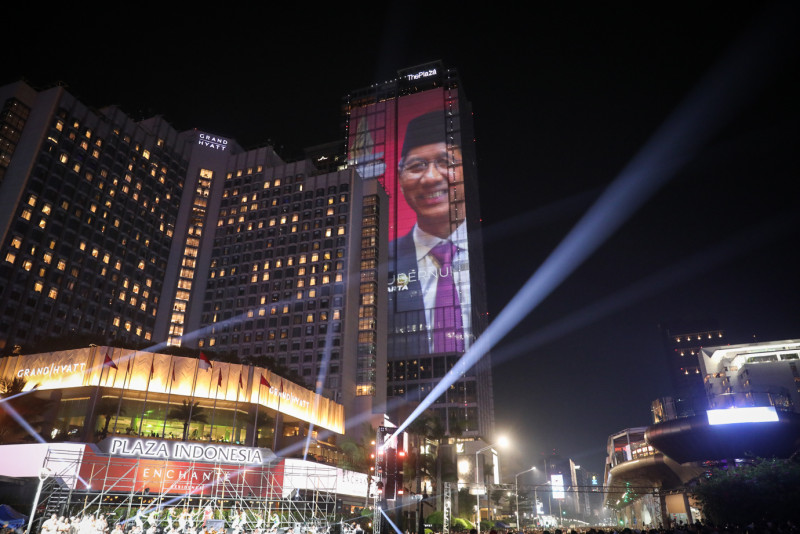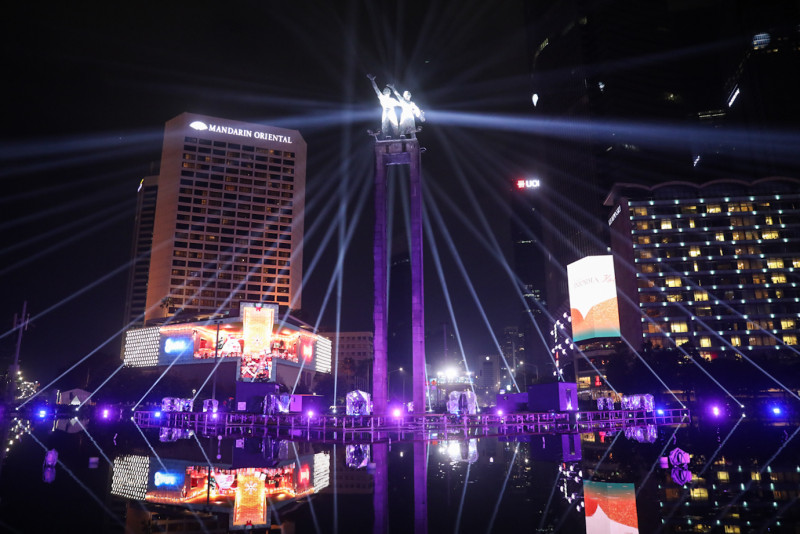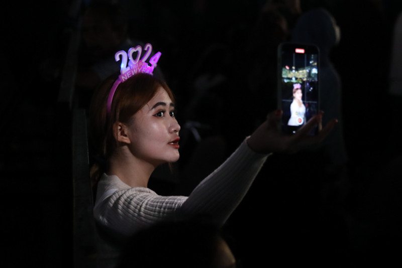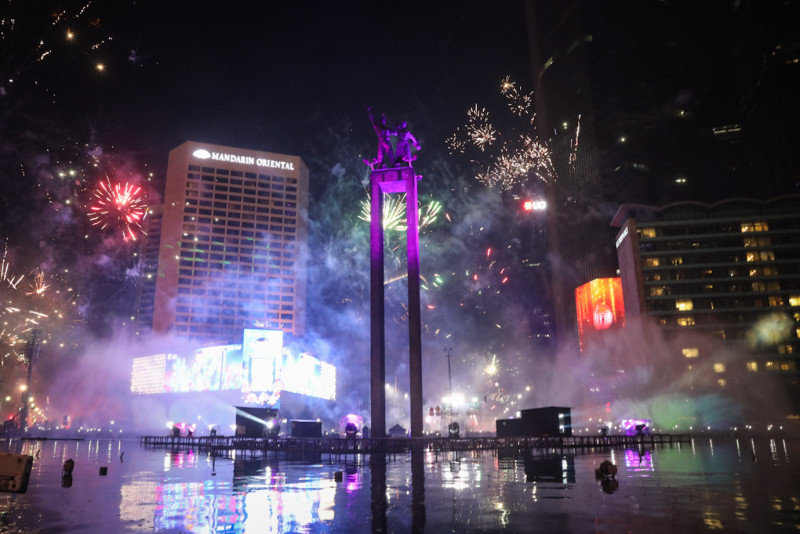 Ribuan warga merayakan malam Tahun Baru 2024 di depan panggung Malam Muda Mudi, kawasan B undaran Hotel Indonesia (HI), Menteng, Jakarta Pusat, Minggu (31/12). Pemerintah Provinsi (Pemprov) DKI Jakarta menghadirkan sejumlah atraksi di antaranya 3D video mapping, konfigurasi drone, water mist, Jakarnaval, serta belasan panggung hiburan di sepanjang Jalan Sudirman-Thamrin untuk merayakan malam pergantian tahun.
