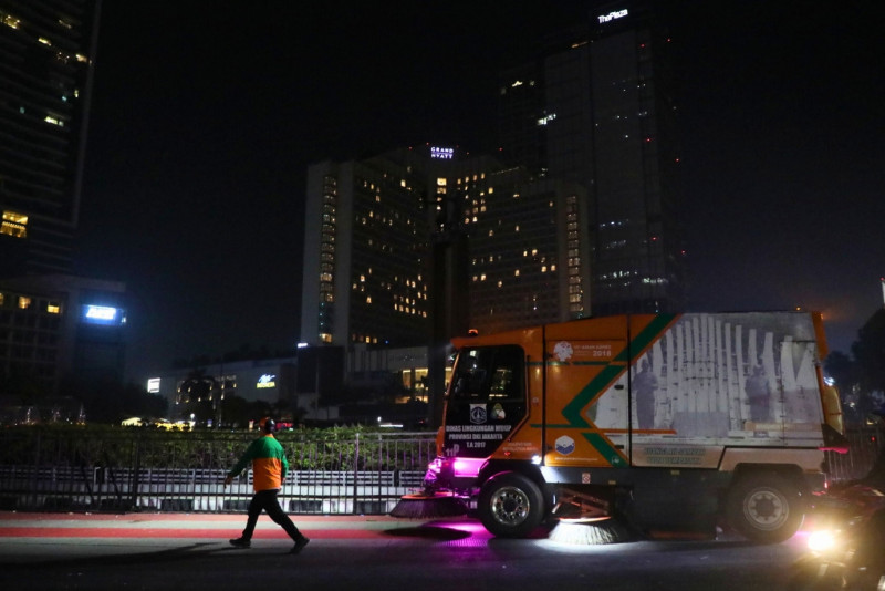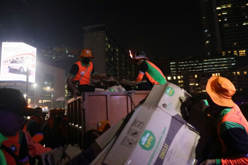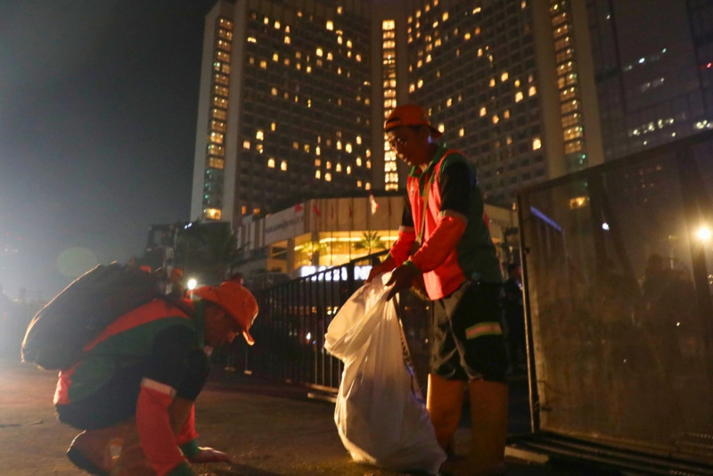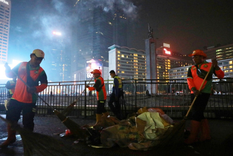 Sebanyak 600 petugas Dinas Lingkungan Hidup (LH) bergerak cepat membersihkan sampah paska perayaan malam pergantian tahun baru 2024 di kawasan Bundaran Hotel Indonesia (HI) , Jalan MH Thamrin, Menteng, Jakarta Pusat, Senin (1/1). Nantinya Sampah yang terkumpul akan dibawa ke sejumlah bank sampah milik Dinas LH untuk didaur ulang kemudian sampah yang tidak bisa didaur ulang akan dibawa ke Tempat Pengelolaan Sampah Terpadu (TPST) Bantar Gebang. Kegiatan pembersihan ini ditargetkan selesai pada pukul 05.00.WIB pagi.