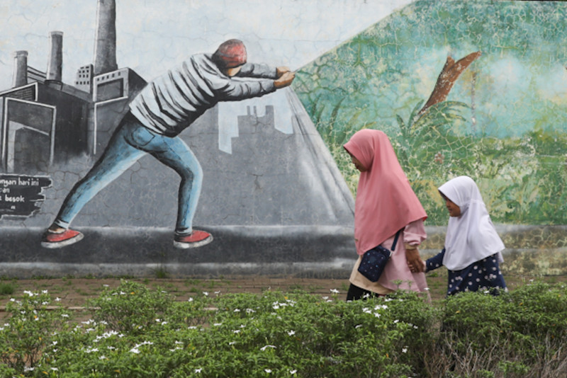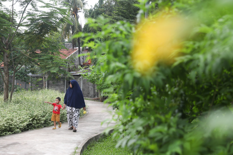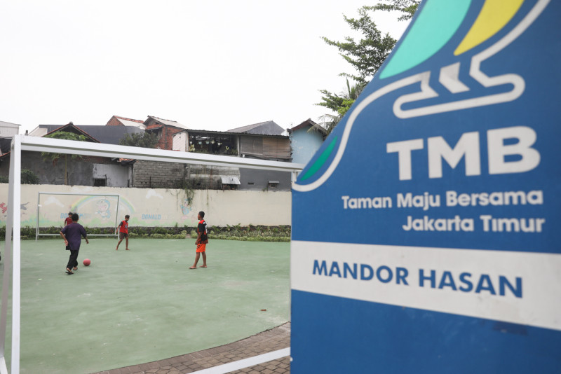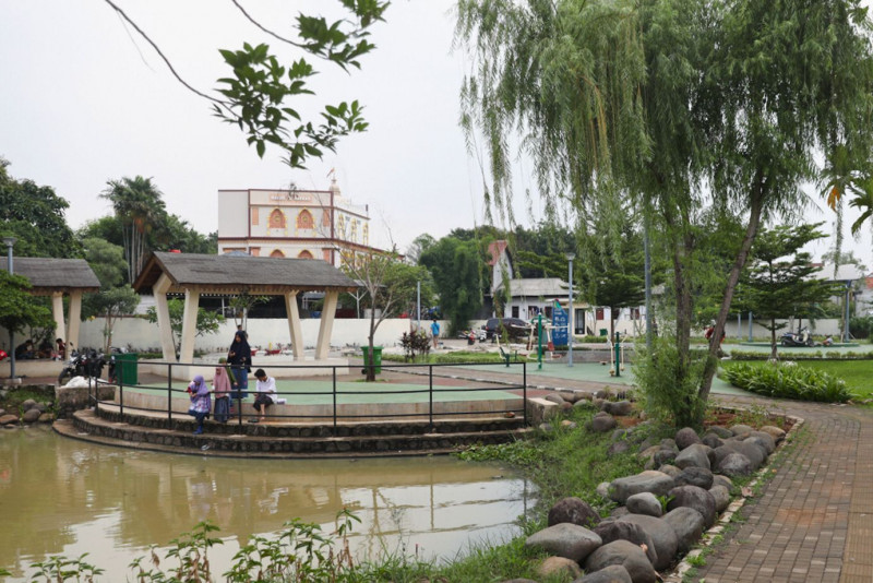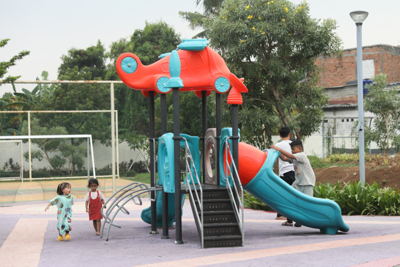 Sejumlah warga mengisi waktu libur Tahun Baru 2024 di Taman Maju Bersama (TMB) Mandor Hasan dengan bermain, berolahraga dan bersantai-santai. Taman ini juga terintegrasi dengan Taman Kasia di Kelurahan Bambu Apus, Cipayung, Jakarta Timur, Senin (1/1). Integrasi TMB Mandor Hasan dan Taman Kasia mengusung konsep Ruang Terbuka Hijau Biru (RHTB) dengan adanya ruang hijau dan ruang biru seperti embung, sungai, maupun danau guna meningkatkan fungsi ekologis.