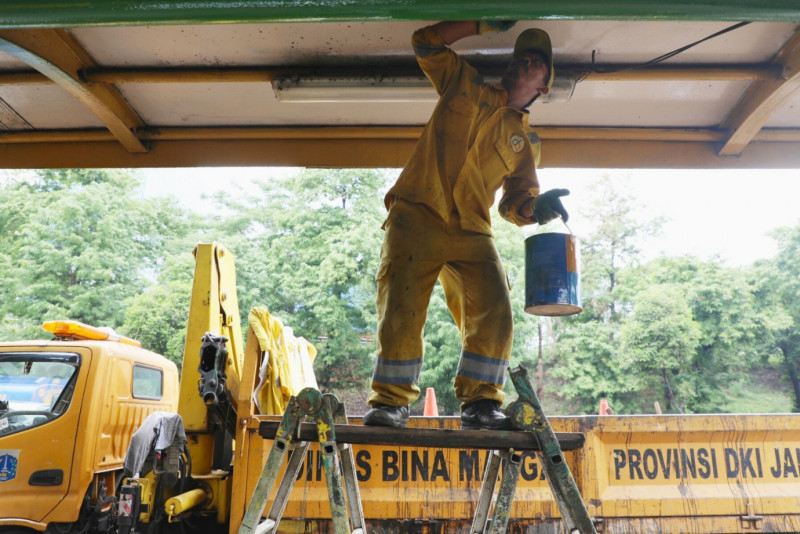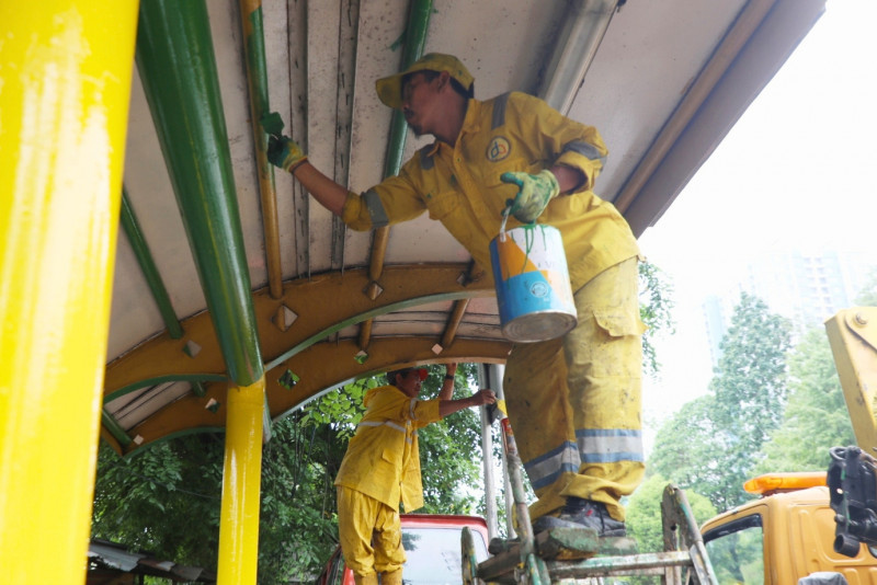 Enam petugas Suku Dinas (Sudin) Bina Marga Jakarta Timur melakukan pengecatan ulang Halte Bus Sekolah Halim PK di Jalan DI Panjaitan, Kebon Pala, Makasar, Jakarta Timur, Rabu (3/1). Pengecatan ini dilakukan karena cat di halte sudah memudar dan menambah kenyamanan bagi para pengguna angkutan umum.