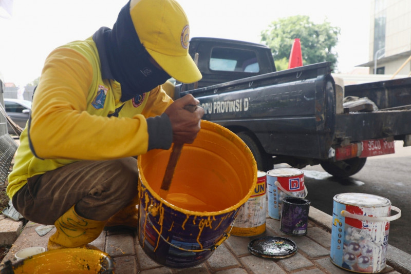 Enam petugas Satuan Pelaksana (Satpel) Bina Marga Duren Sawit mengecat jembatan di Jalan Raya Kalimalang, Cipinang Melayu, Makasar, Jakarta Timur, Jumat (5/1). Pengecatan sepanjang 40 meter ini dilakukan karena sebelumnya warna mulai memudar dan dipenuhi dengan berbagai macam coretan.