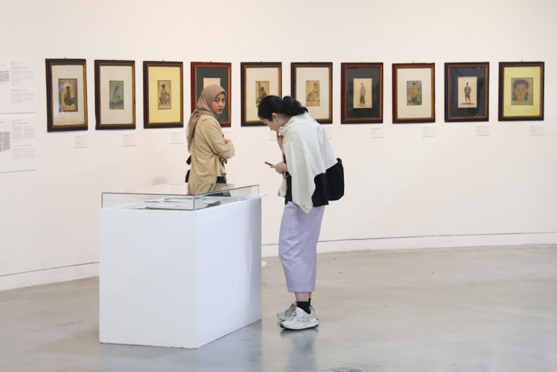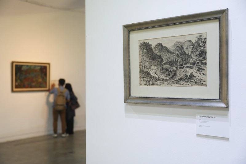 Sejumlah pengunjung mengamati karya seni dalam pameran Kartono Yudhokusumo: Karya dan Arsip di Galeri Salihara, Pasar Minggu, Jakarta Selatan, Sabtu (6/1). Pameran tersebut menampilkan sketsa dan karya Kartono Yudhokusumo (1924-1957) yang merupakan seniman yang banyak meluks pemandangan, alam benda, bangunan serta suasana pada masa revolusi.