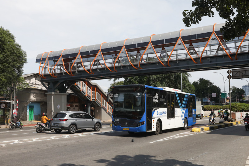Sejumlah warga menyeberang di jembatan penyeberangan orang (JPO) Kebayoran di Jalan Teuku Nyak Arief, Kebayoran Lama, Jakarta Selatan, Selasa (9/1). JPO Kebayoran merupakan salah satu dari lima JPO baru yang telah selesai pembangunannya oleh Dinas Bina Marga DKI Jakarta pada Januari 2024.