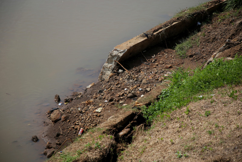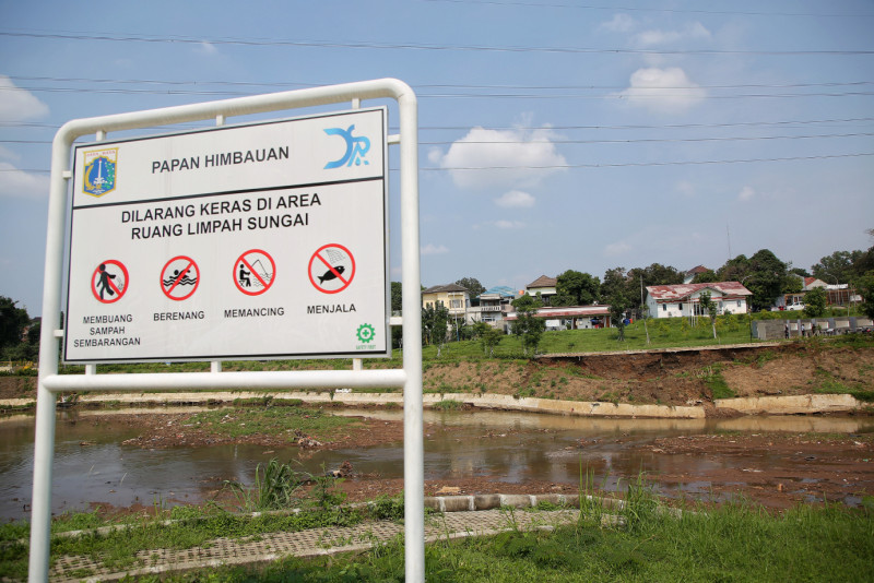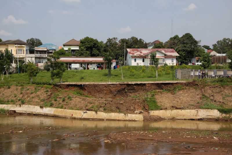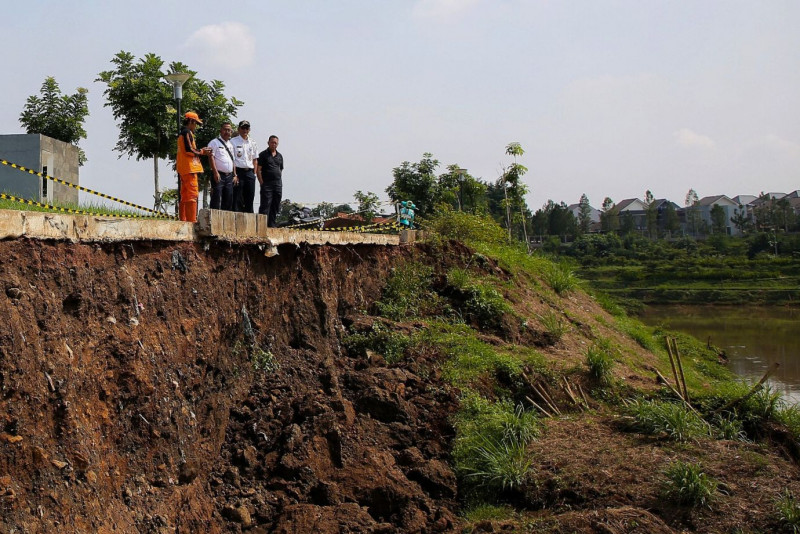 Lurah Pondok Ranggon, Jenuri beserta jajaran meninjau turap longsor di Ruang Limpah Sungai Pondok Ranggon1, Cipayung, Jakarta Timur, Rabu (10/1). Turap longsor sepanjang 40 meter dengan ketinggian tujuh meter tersebut disebabkan curah hujan yang tinggi pada Minggu (7/1) sore.