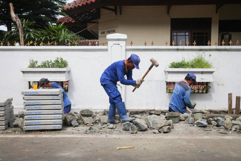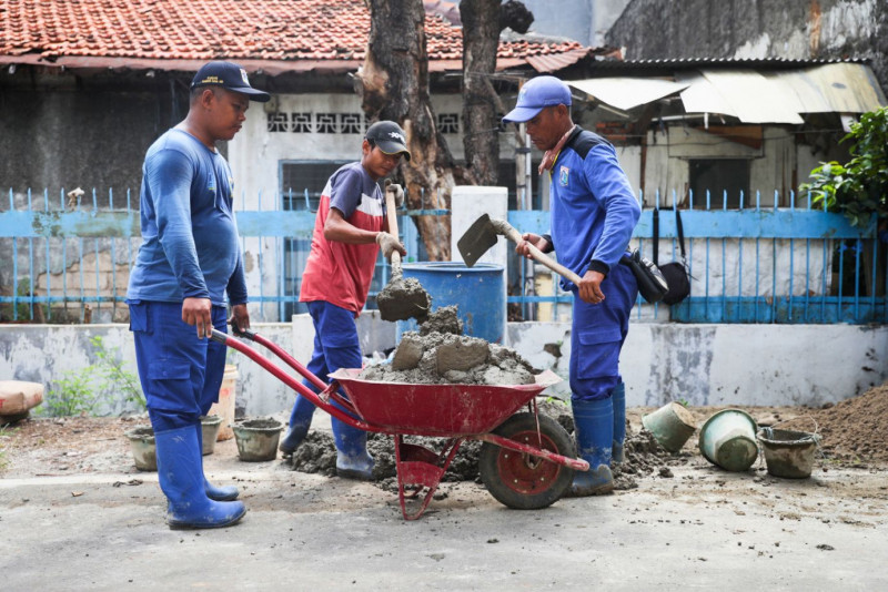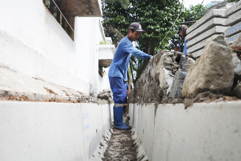 Petugas Suku Dinas Sumber Daya Air (Sudin SDA) Jakarta Pusat memperbaiki saluran di Jalan Cempaka Putih Timur IX, Cempaka Putih, Jakarta Pusat, Kamis (11/1). Perbaikan yang dikerjakan oleh 17 petugas tersebut dilakukan untuk menambah kapasitas saluran agar air mengalir lebih lancar.