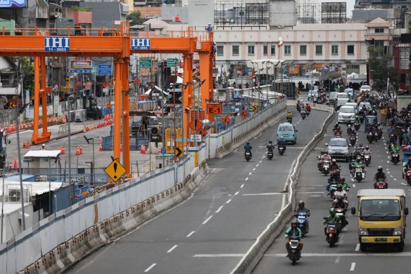 Sejumlah pekerja konstruksi melakukan pengerjaan proyek MRT Jakarta fase 2A CP 202 di Jalan Hayam Wuruk, Taman Sari, Jakarta Barat, Jumat (12/1). Progres pengerjaan proyek MRT fase 2A CP 202 yang terdiri dari Stasiun Harmoni, Sawah Besar dan Mangga Besar telah mencapai 23,81 persen per 25 Desember 2023.