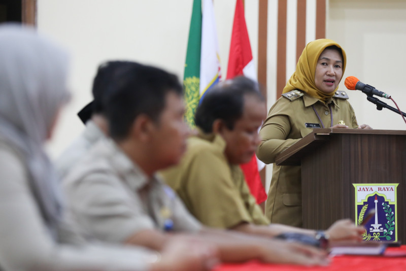 Wakil Wali Kota Jakarta Timur, Iin Mutmainnah dan Camat Pulogadung, Syafrudin Chandra melakukan seremoni penyelesaian renovasi sedang Kantor Kecamatan Pulogadung, Jakarta Timur, Senin (15/1). Renovasi Kantor Kecamatan Pulogadung meliputi perbaikan lantai, atap, serta kamar mandi secara keseluruhan dari lantai satu sampai lantai empat.