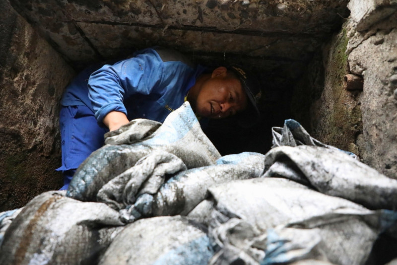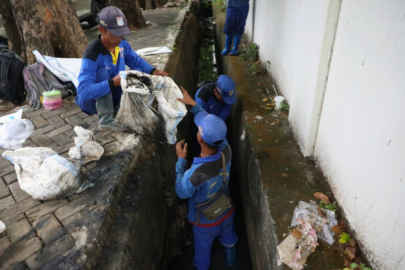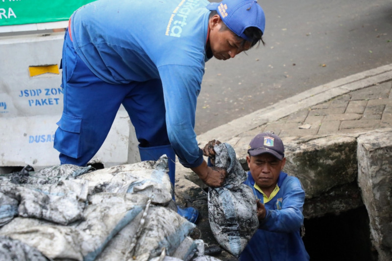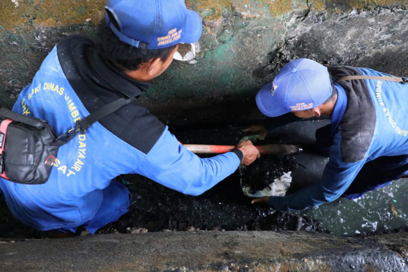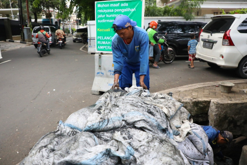 Petugas Satuan Pelaksana Sumber Daya Air (Satpel SDA) menguras saluran di Jalan Cimandiri, Cikini, Menteng, Jakarta Pusat, Selasa (16/1). Dalam pengurasan ini, petugas dapat mengangkut 100 karung lumpur per hari.