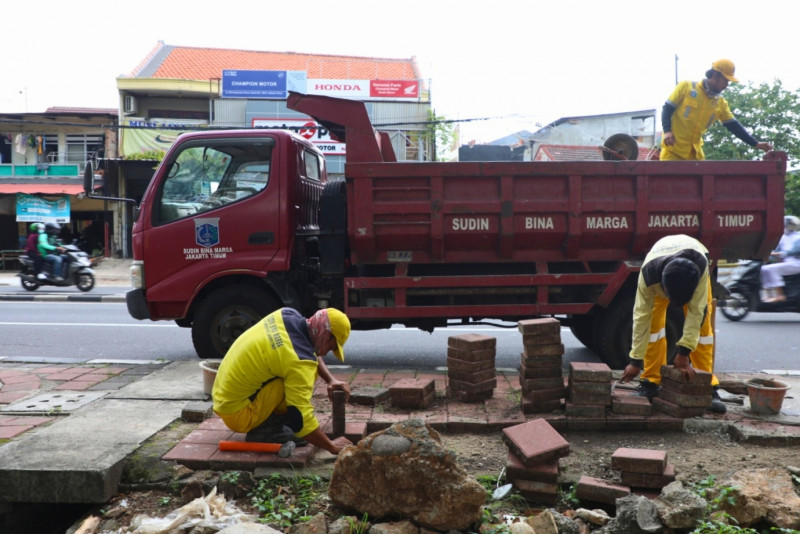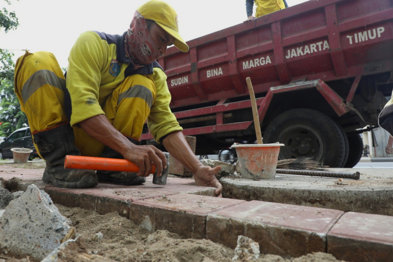 Empat Petugas Satuan Pelaksana (Satpel) Bina Marga memperbaiki trotoar di Jalan RS Soekamto, Malaka Jaya, Duren Sawit, Jakarta Timur, Rabu (17/1). Perbaikan trotoar sepanjang lima meter dengan lebar 60 sentimeter ini dilakukan karena trotoar sudah rusak termakan usia.