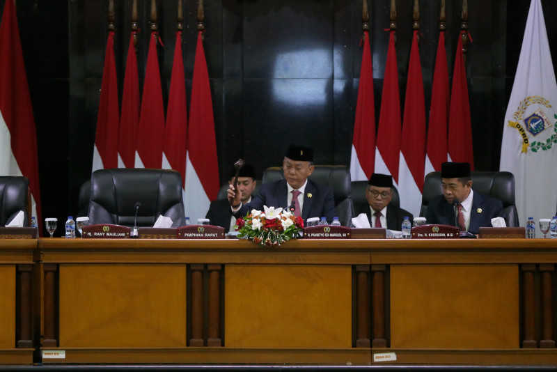 Penjabat (Pj) Gubernur DKI Jakarta, Heru Budi Hartono menghadiri rapat paripurna pengucapan sumpah dan janji pengganti antar waktu (PAW) tiga anggota DPRD DKI Jakarta dari Fraksi Partai Demokrasi Indonesia Perjuangan (PDI-P) sisa masa jabatan 2019-2024 di Gedung DPRD DKI Jakarta, Gambir, Jakarta Pusat, Rabu (17/1). Ketiga anggota dewan yang dilantik yaitu Boyke Hasiholan Simanjuntak untuk menggantikan Steven Setia Budi Musa, Simon Sitorus untuk menggantikan Gembong Warsono, dan Sunggul Sirait untuk menggantikan Cinta Mega.