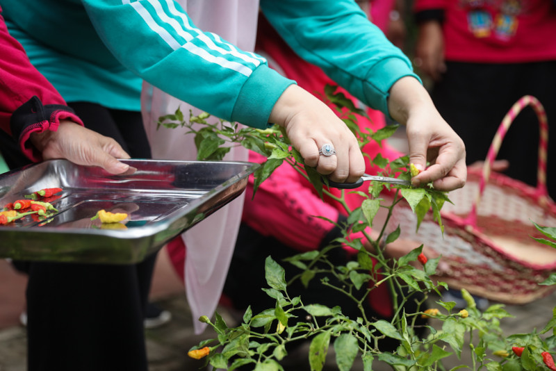 Ketua Tim Penggerak Pemberdayaan Kesejahteraan Keluarga (TP PKK), Essie Munjirin memanen cabai di RPTRA Pinang Pola, Pondok Labu, Cilandak, Jakarta Selatan, Kamis (18/1). Panen cabai dilakukan serentak di 137 titik di wilayah Jakarta Selatan.