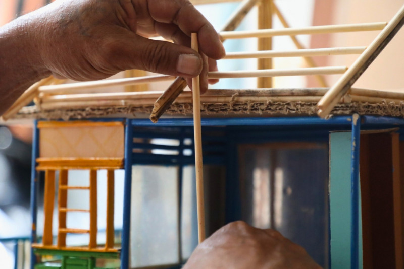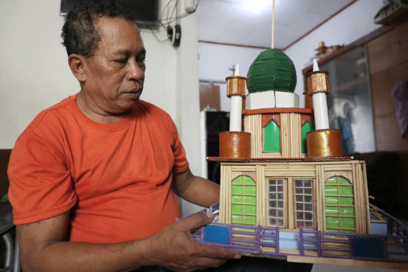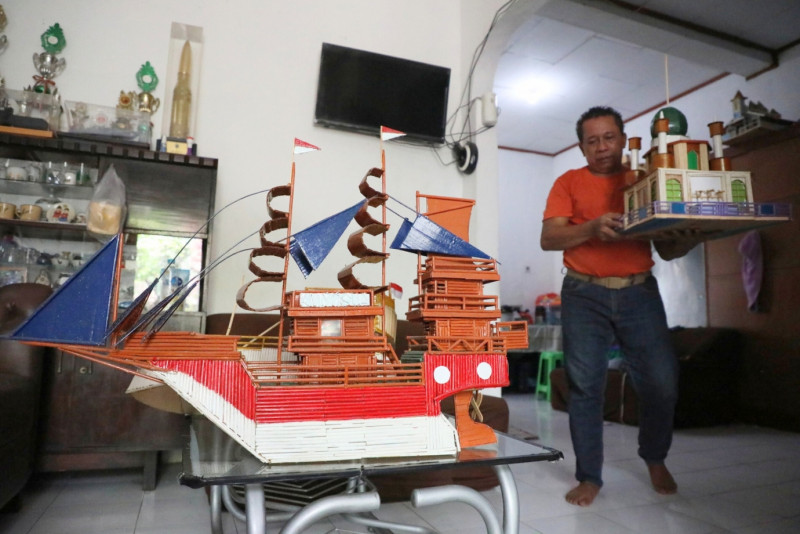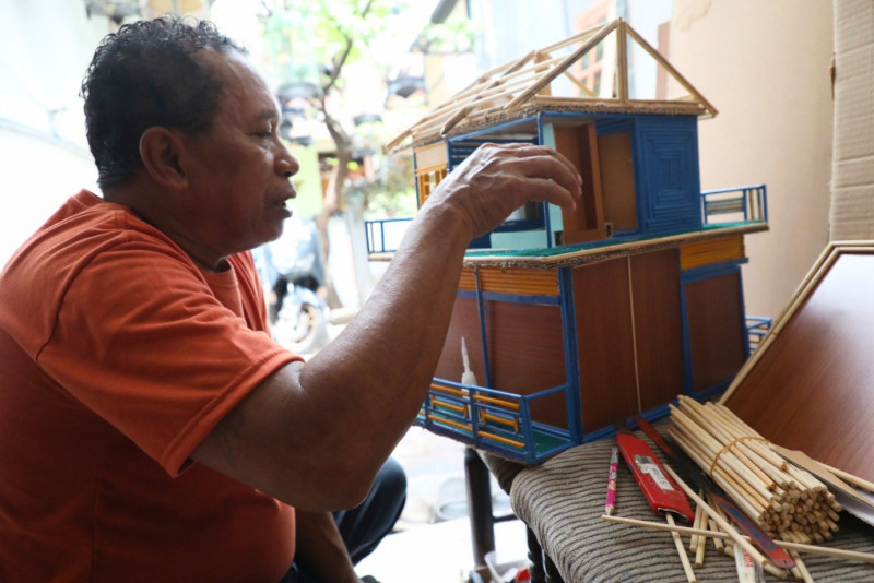 Jimmy Alexander, warga Kali Pasir, Cikini, Menteng, Jakarta Pusat menyulap limbah sumpit menjadi kerajinan miniatur seperti rumah, tempat ibadah, kapal dll. Senin (22/1). Limbah sumpit didapatkan dari para pedagang di sekitar rumahnya.