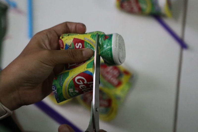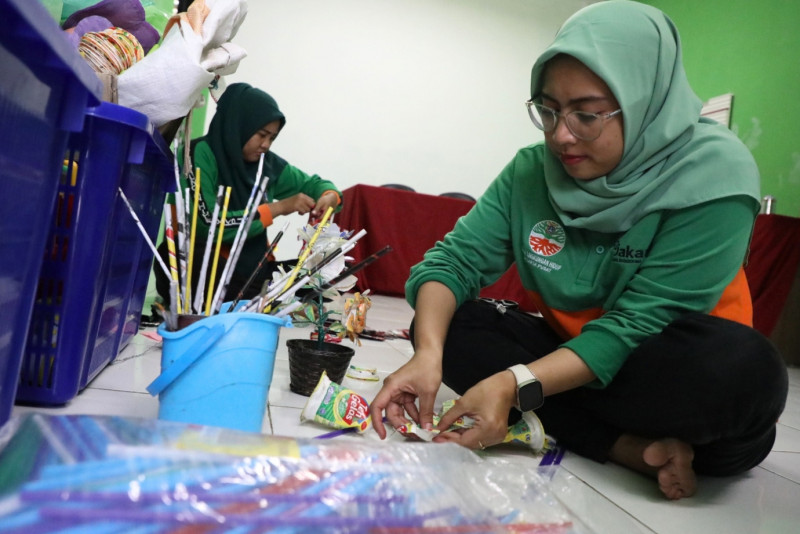 Petugas Satuan Pelaksana Lingkungan Hidup (Satpel LH) Kecamatan Gambir mengubah sampah menjadi berbagai kerajinan tangan di Tempat Pengolahan Sampah Reduce, Reuse, Recycle (TPS 3R) Ketapang, Jalan Kyai Haji Zainul Arifin, Duri Pulo, Jakarta Pusat, Rabu (24/1). Berbagai kerajinan yang dibuat seperti tempat pensil, tas, hiasan rumah dll.