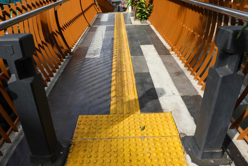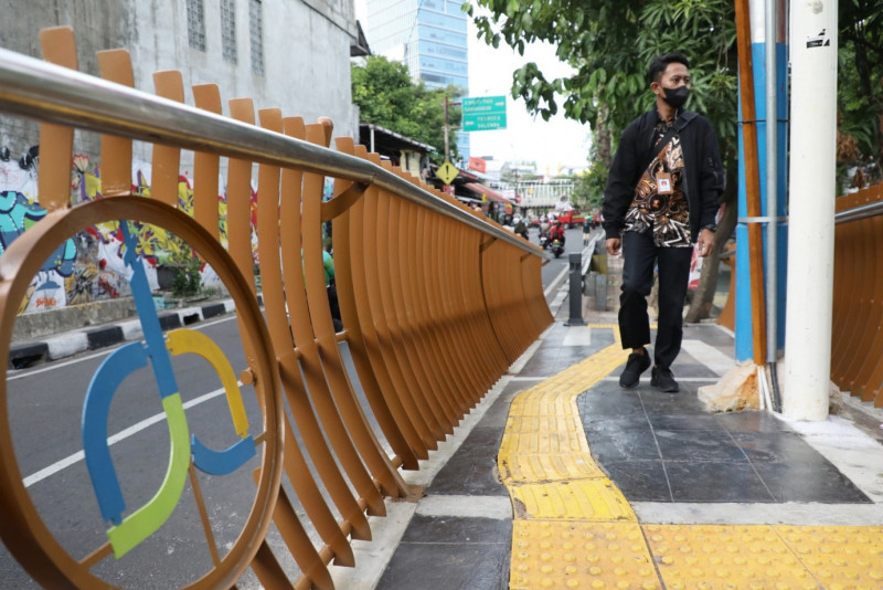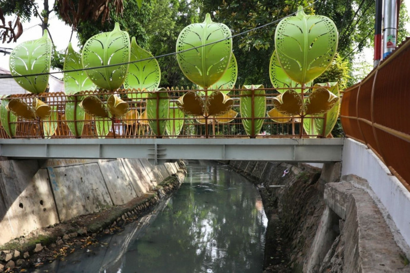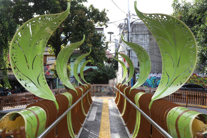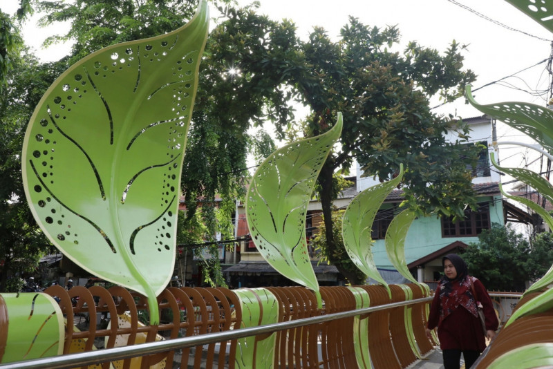 Sejumlah warga memanfaatkan Jembatan Antar Kampung (JAK) Balai Rakyat 1 di Jalan Balai Rakyat, Utan Kayu Utara, Matraman, Jakarta Timur, Rabu (24/1). Jembatan yang memiliki panjang 9,3 meter dan bertema dedaunan ini merupakan satu dari enam jembatan yang dibuat oleh Suku Dinas (Sudin) Bina Marga Jakarta Timur untuk memudahkan warga melintas dari Jalan Balai Rakyat dan Jalan Galur Sari Timur.