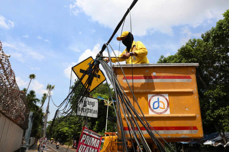 Delapan petugas Suku Dinas (Sudin) Bina Marga Jakarta Timur menertibkan kabel udara sepanjang 300 meter di Jalan Laut Arafuru, Pondok Bambu, Duren Sawit, Kamis (25/1). Penertiban ini dilakukan untuk menambah keindahan serta kerapian tata kota.