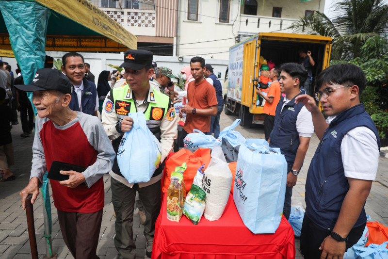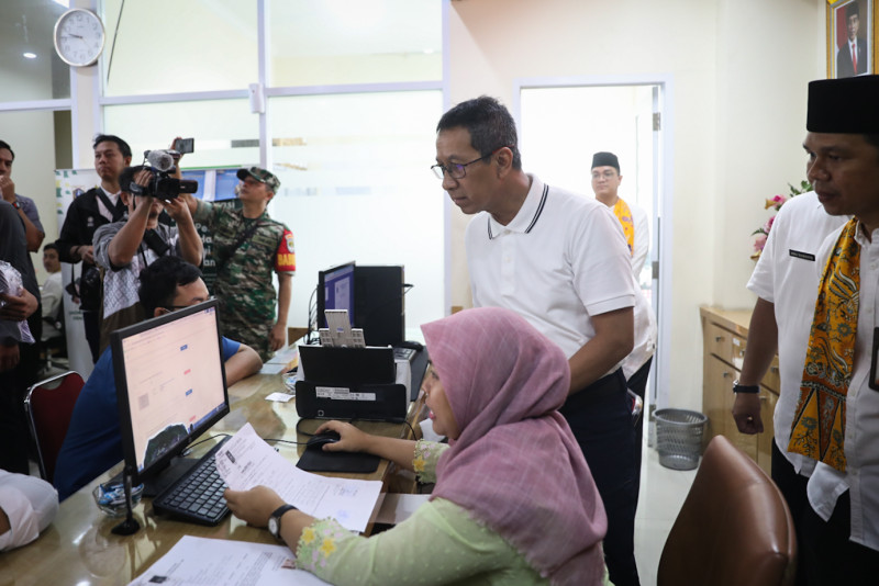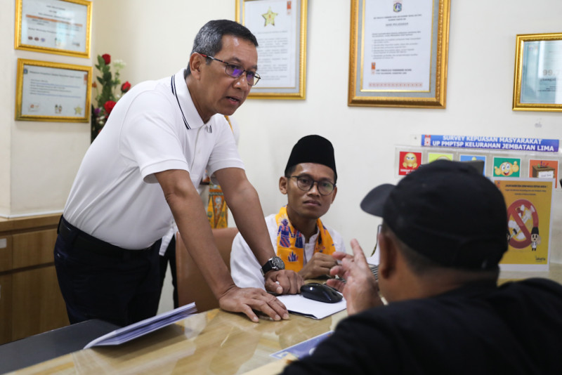Penjabat (Pj) Gubernur DKI Jakarta, Heru Budi Hartono meninjau pasar sembako murah di Kantor Kelurahan Jembatan Lima, Tambora, Jakarta Barat, Jumat (26/1). Pj Gubernur juga melihat pelayanan di loket Pelayanan Terpadu Satu Pintu (PSTP) kelurahan tersebut usai meninjau pasar sembako murah.