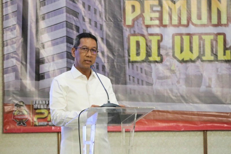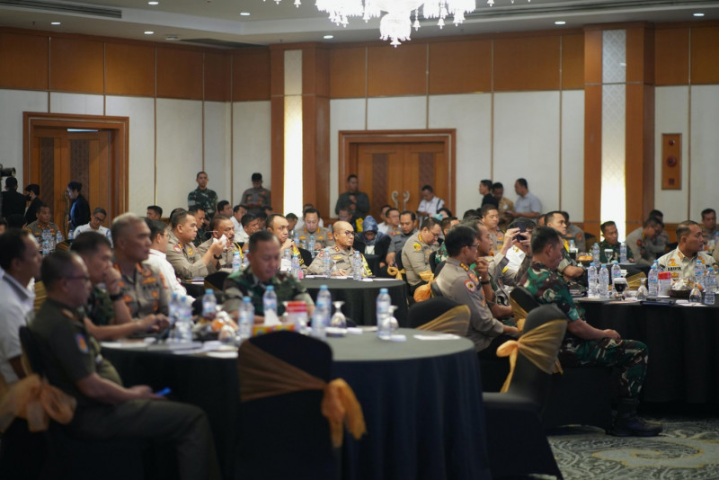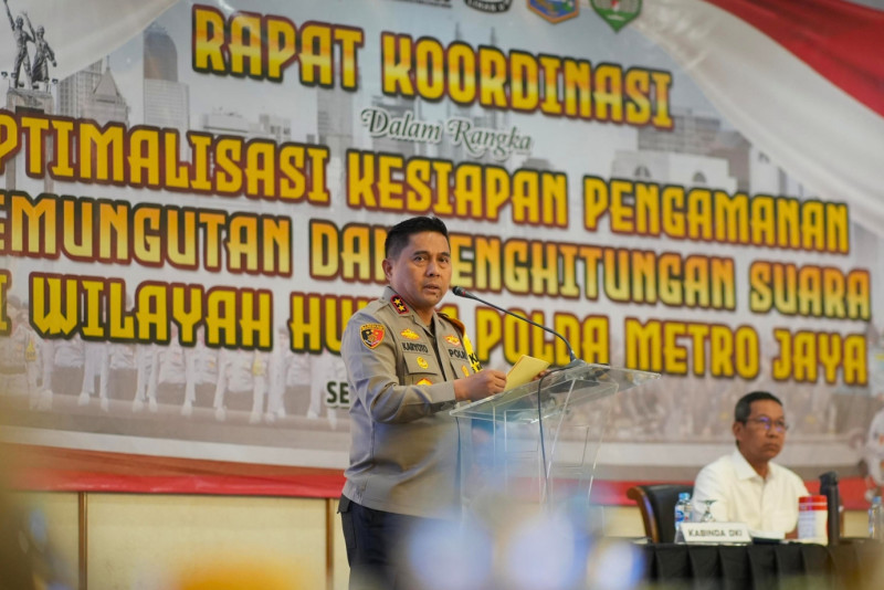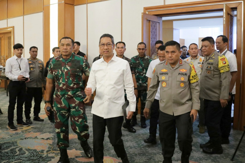 Penjabat (Pj) Gubernur Provinsi DKI Jakarta, Heru Budi Hartono menghadiri rapat koordinasi (Rakor) optimalisasi kesiapan pengamanan pemungutan dan penghitungan suara di wilayah hukum Polda Metro Jaya, bersama jajaran Polda Metro Jaya dan Kodam Jaya, di Hotel Sahid, Jakarta Pusat, Senin (29/1). Dalam sambutannya Pj Gubernur mengajak seluruh pihak bersinergi untuk mendukung kelancaran pelaksanaan setiap tahapan Pemilihan Umum (Pemilu) 2024.
