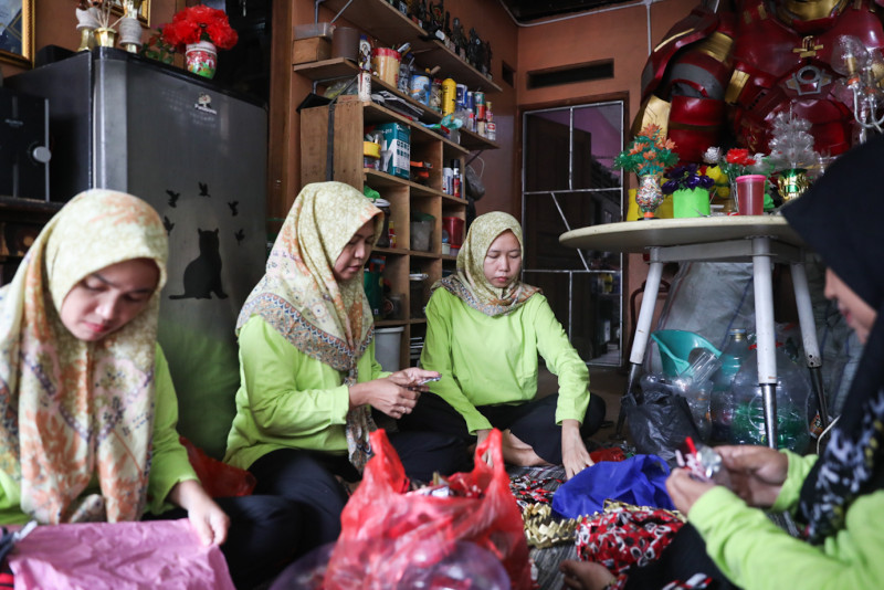 Sejumlah warga membuat produk kerajinan daur ulang sampah di Bank Sampah Persatuan, Duren Sawit, Jakarta Timur, Selasa (30/1). Kerajinan hasil daur ulang berbentuk tas, lampu hias dan berbagai ornamen tersebut dijual mulai dari Rp. 30.000 - Rp.150.000 per buah.