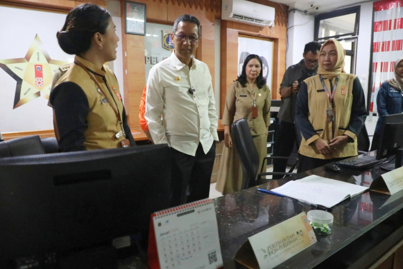 Penjabat (Pj) Gubernur Provinsi DKI Jakarta, Heru Budi Hartono meninjau Pasar Sembako Murah di Kantor Kecamatan Makasar, Jakarta Timur, Selasa (30/1). Dalam kegiatan ini Pj Gubernur mengapresiasi keterlibatan sektor swasta dalam kegiatan ini.