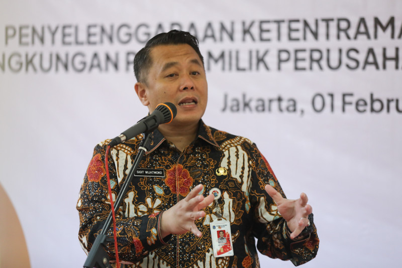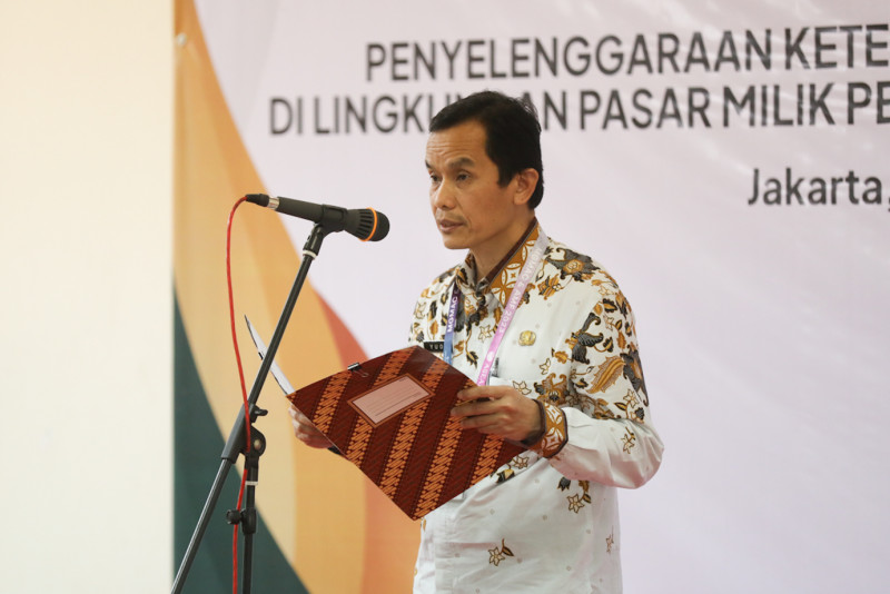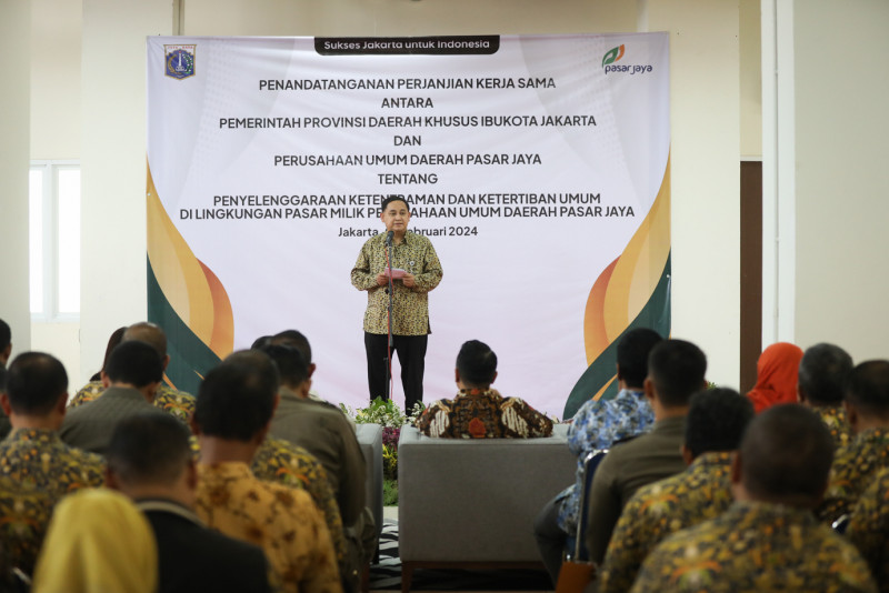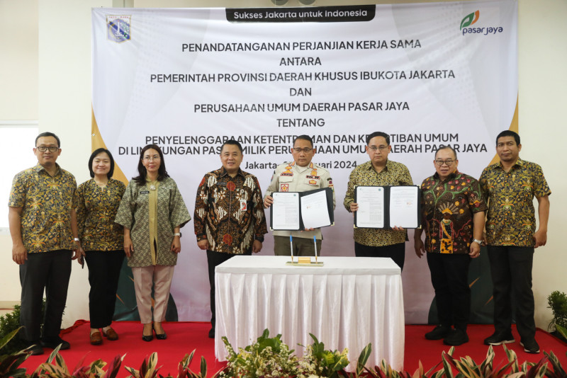 Pemerintah Provinsi DKI Jakarta melalui Satpol PP menjalin kerja sama dengan Perumda Pasar Jaya di Aula Pasar Rumput, Setiabudi, Jakarta Selatan, Kamis (1/2). Perjanjian kerja sama yang ditandatangani oleh Kepala Satpol PP, Arifin dan Dirut Perumda Pasar Jaya, Agus Himawan Widiyanto tersebut terkait penyelenggaraan ketentraman dan ketertiban umum (Tibum) di lingkungan pasar.