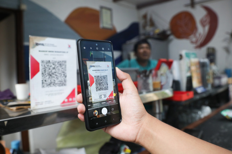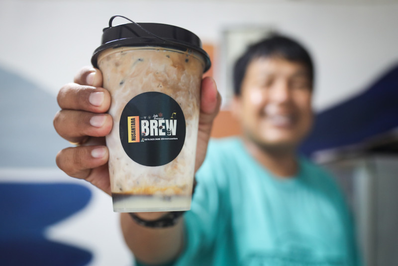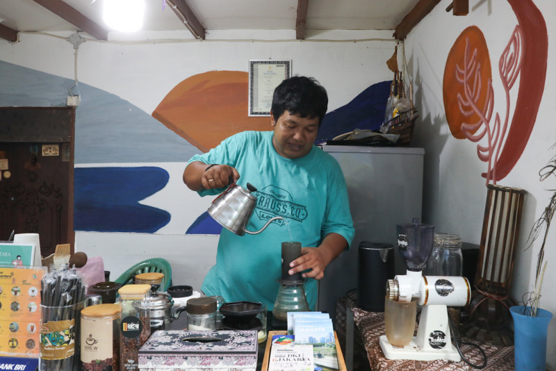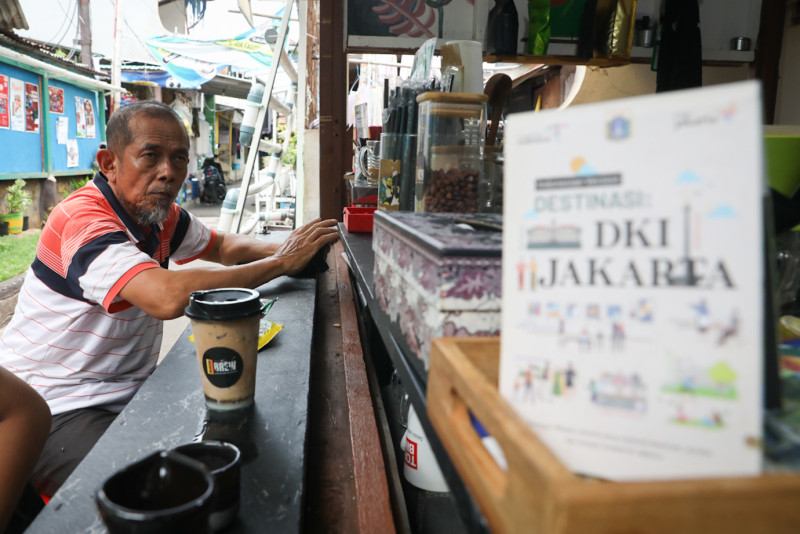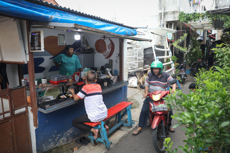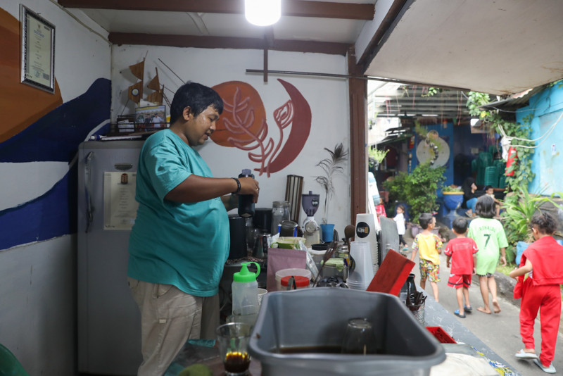 Seorang warga menikmati kopi di Warkop Brew Nusantara yang berada di Gang Sumbadra RT 15/08, Tanah Tinggi, Johar Baru, Jakarta Pusat, Kamis (1/2). Warung kopi binaan Jakpreneur Dinas PPKUKM DKI Jakarta ini memiliki keunikan karena berada dalam gang kecil di tengah pemukiman padat penduduk.